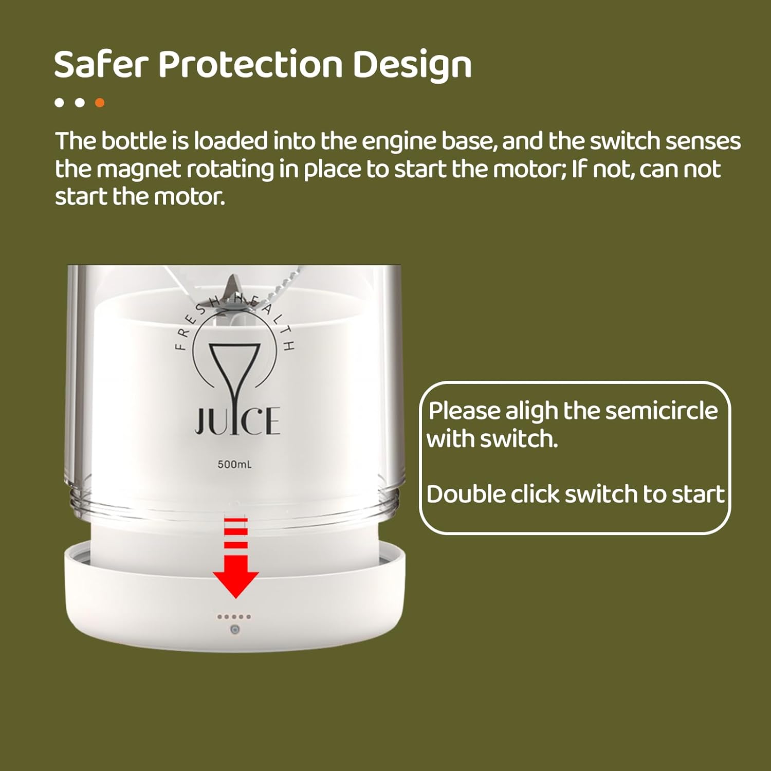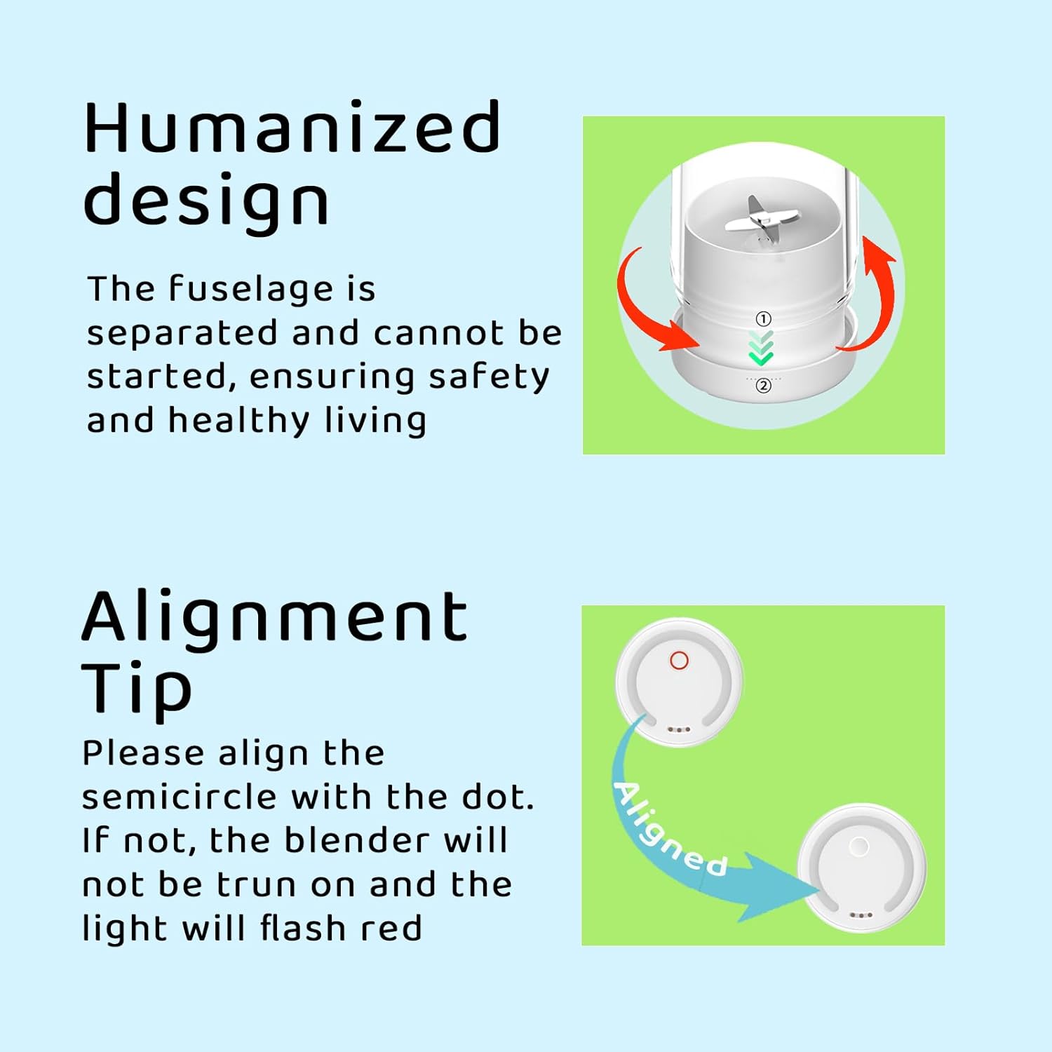 - SMART LOCKING PROTECTION: The portable blender for milkshakes and smoothies features built-in magnetic induction protection. If the cap or base is not tightened, the blender will not work properly. It will also flash a red light as a reminder to prevent accidents from accidentally starting the blades.