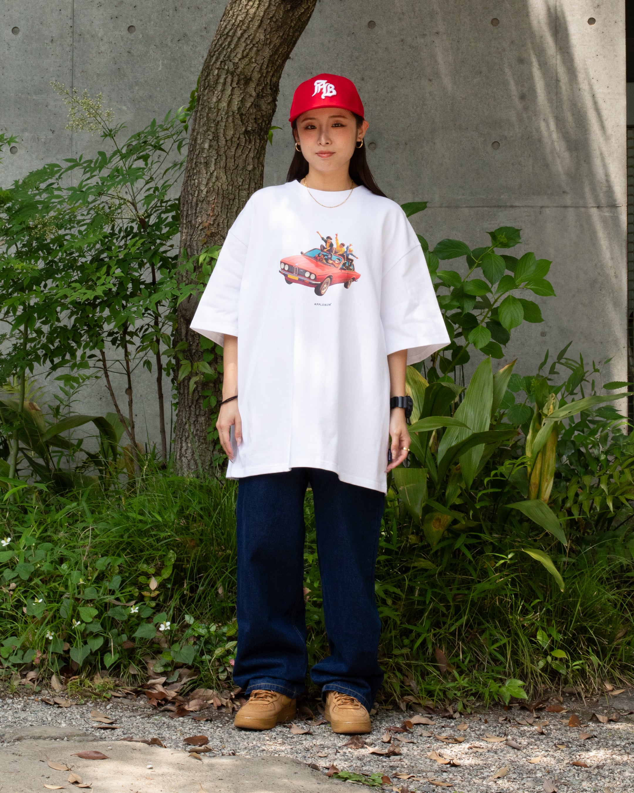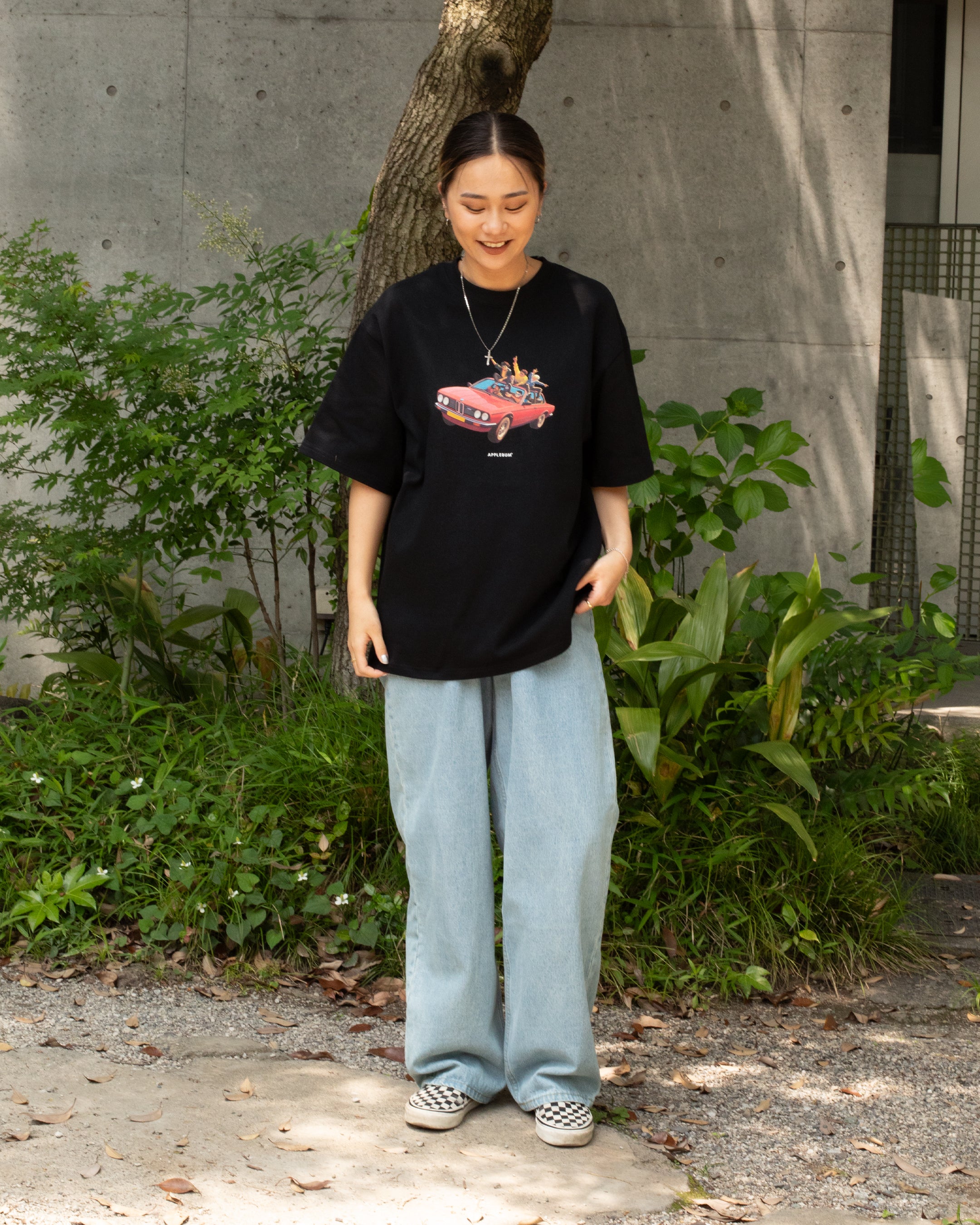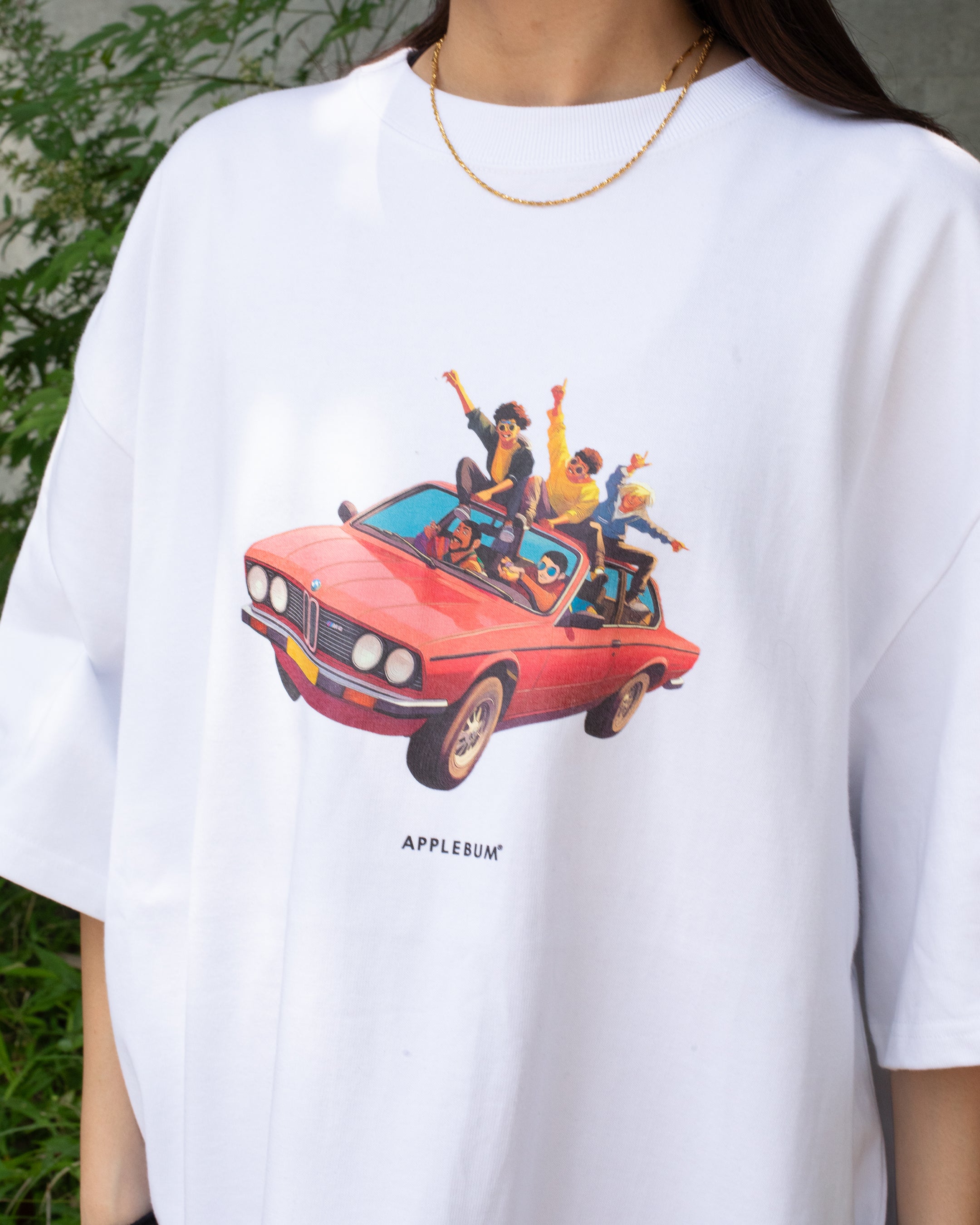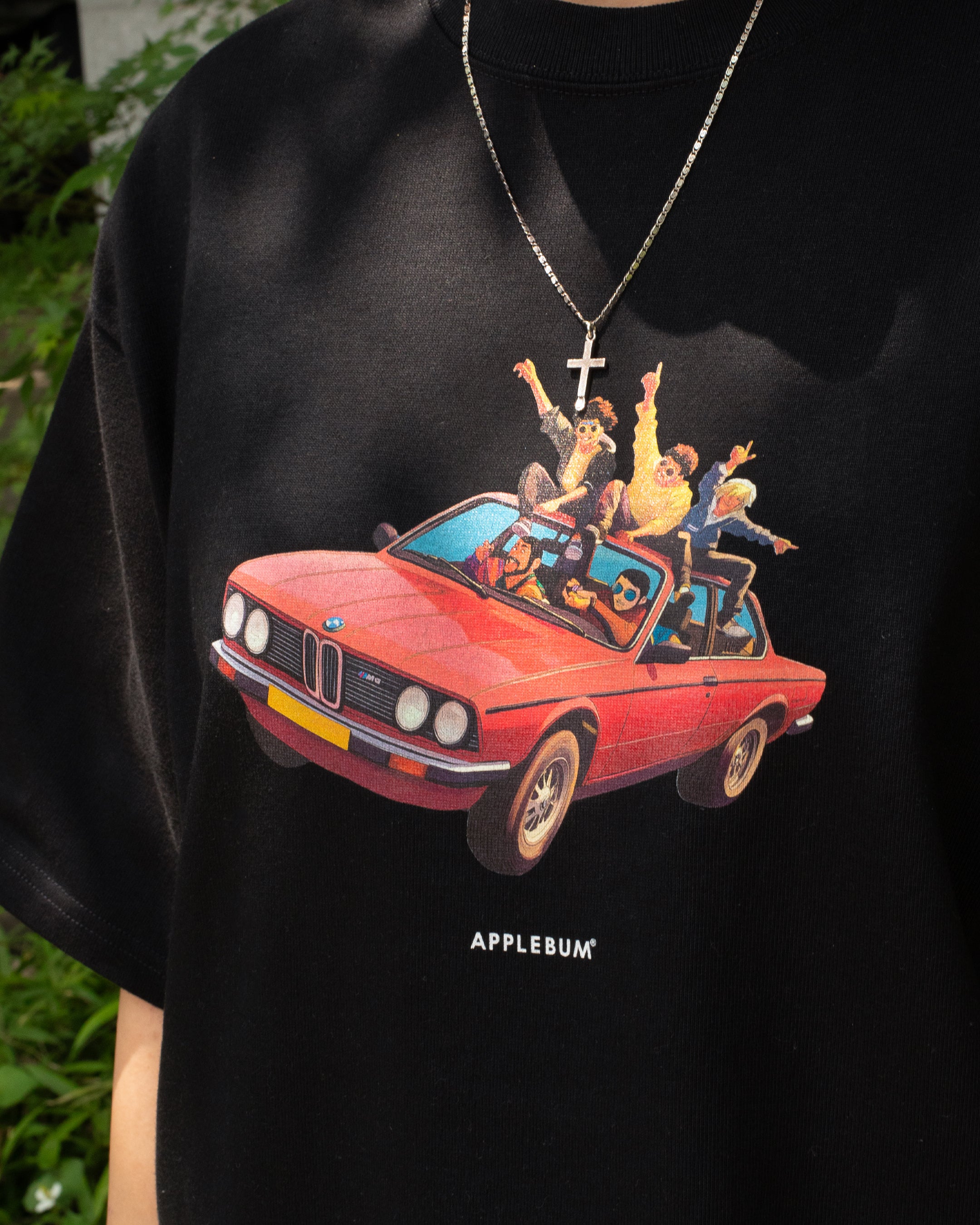 This graphic T-shirt captures a scene from youth, depicting students riding on the side of a car while blasting music and making noise.