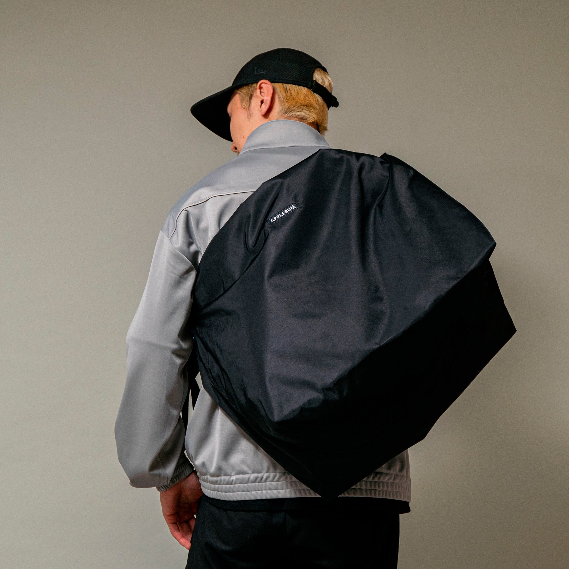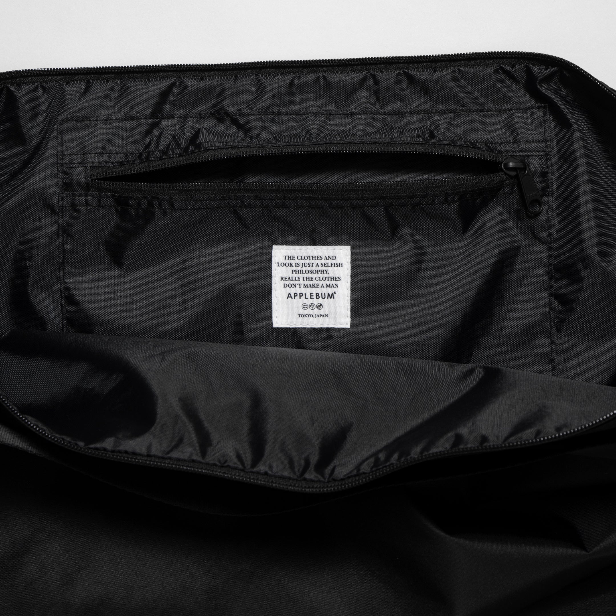 A large shoulder bag made of water-repellent nylon material that is smooth to the touch and has an elegant sheen.