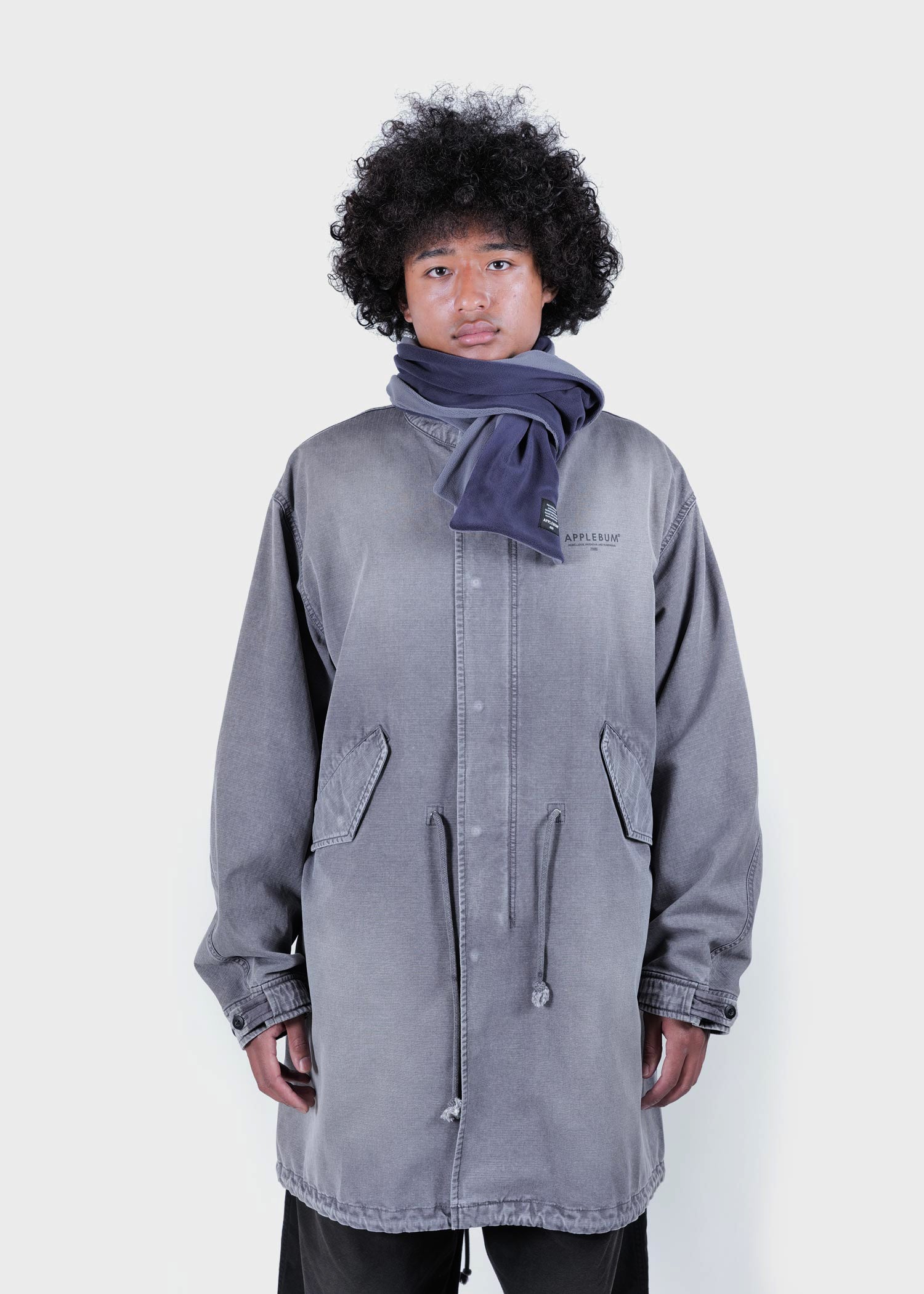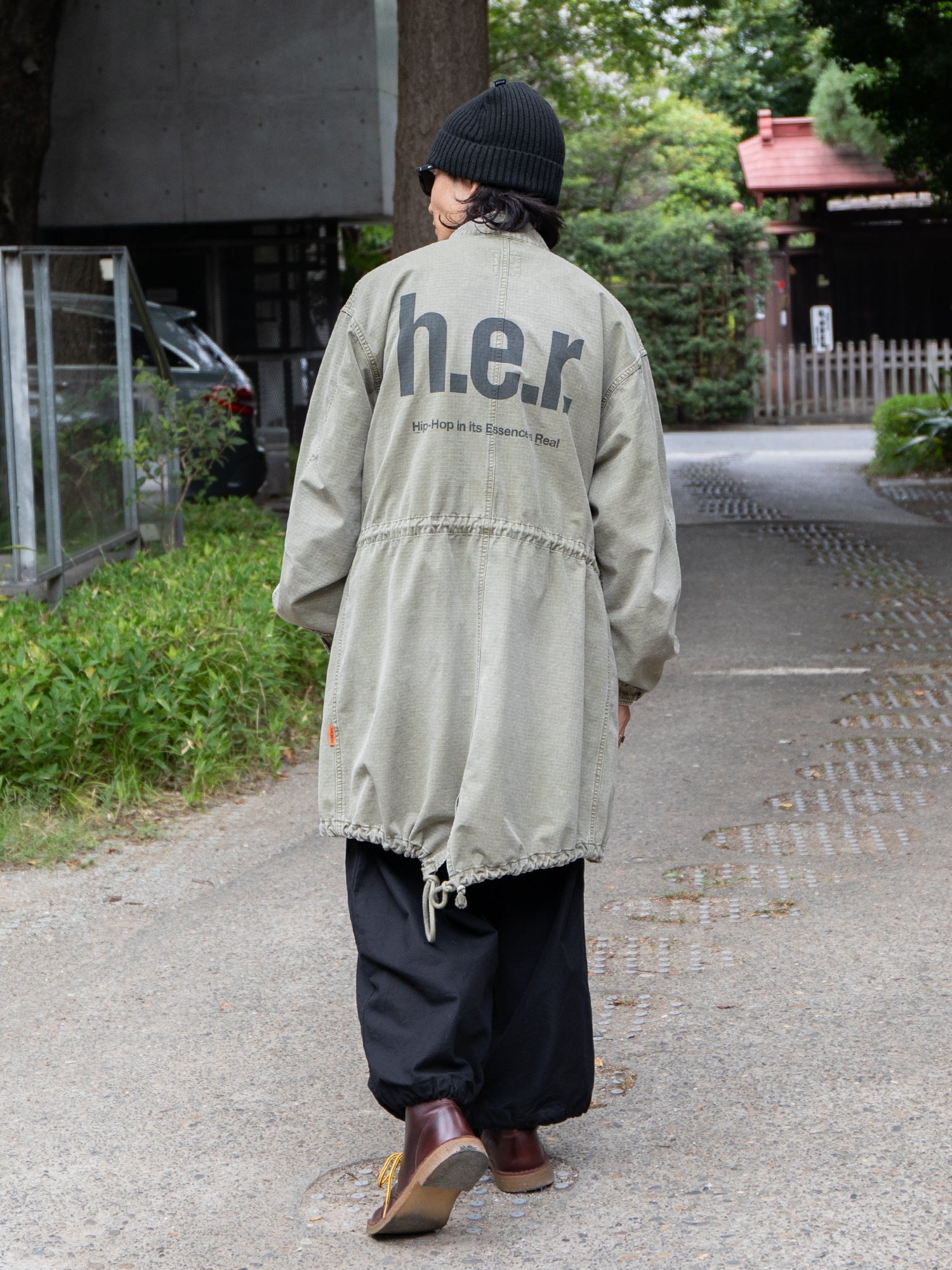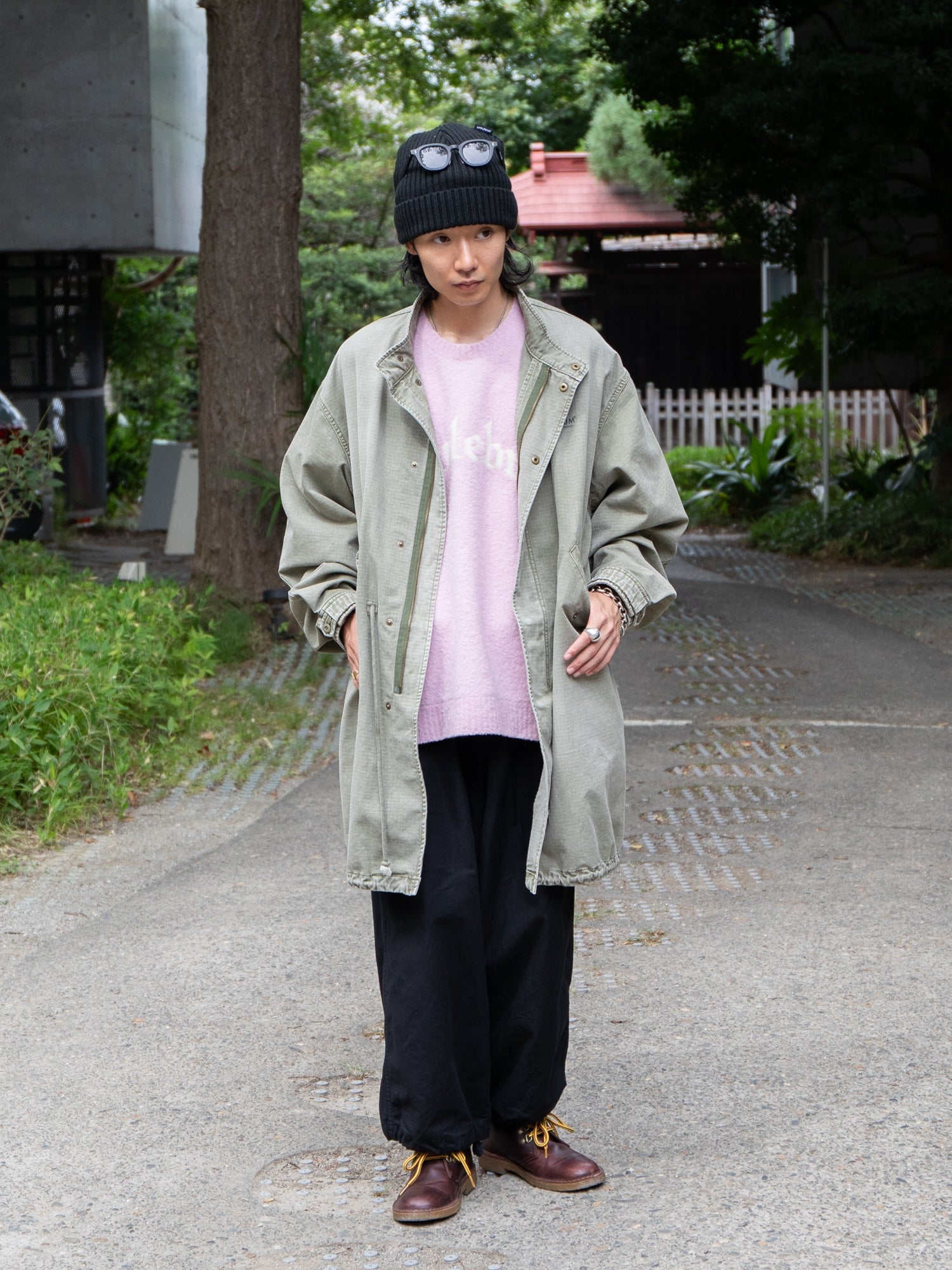 This modern military item is oversized and designed for layering.
