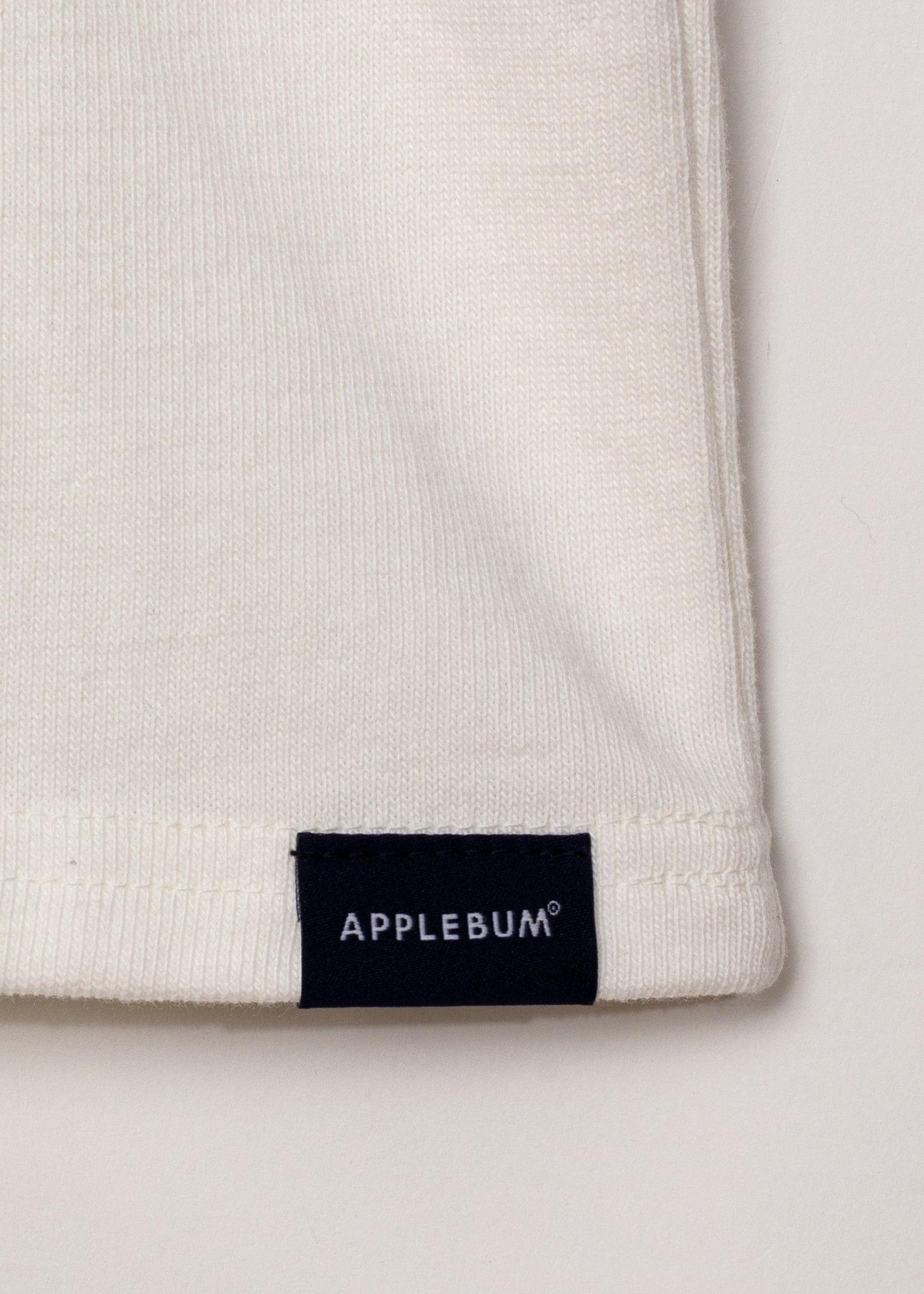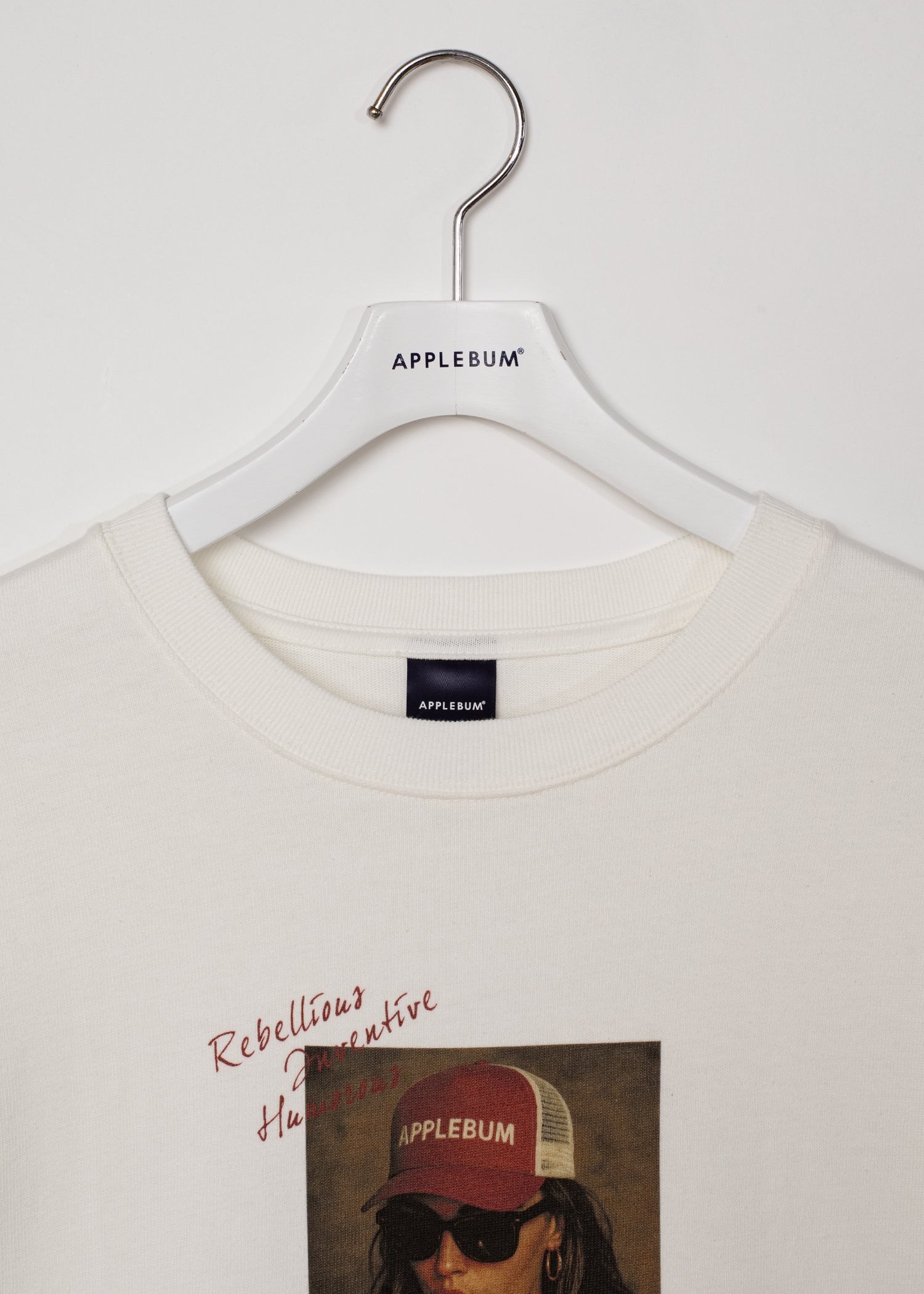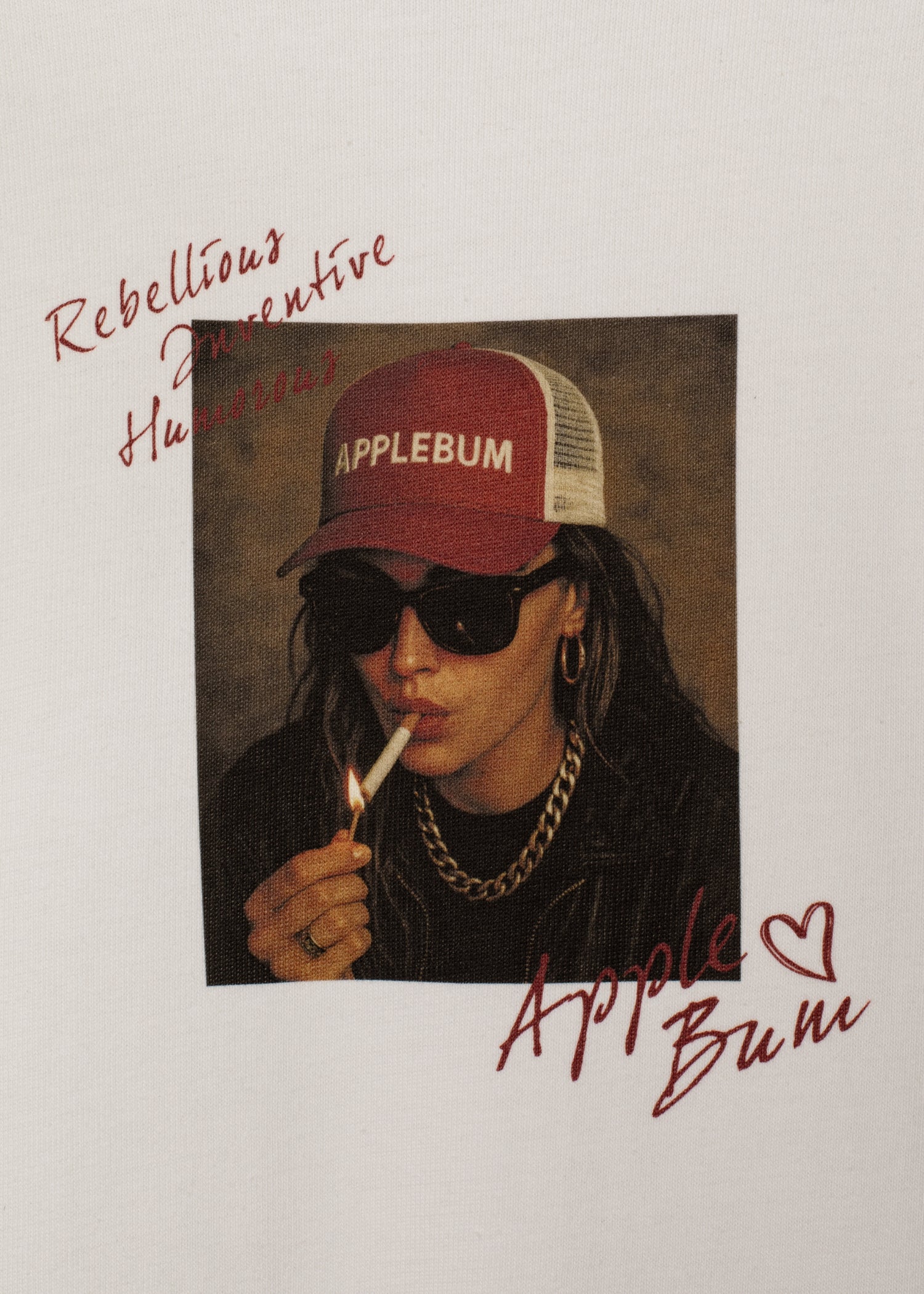 A photo T-shirt that captures the moment when a fictional model wearing a mesh cap with the APPLEBUM logo lights up a cigarette.