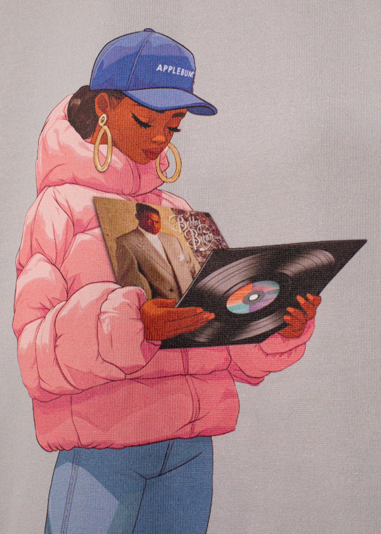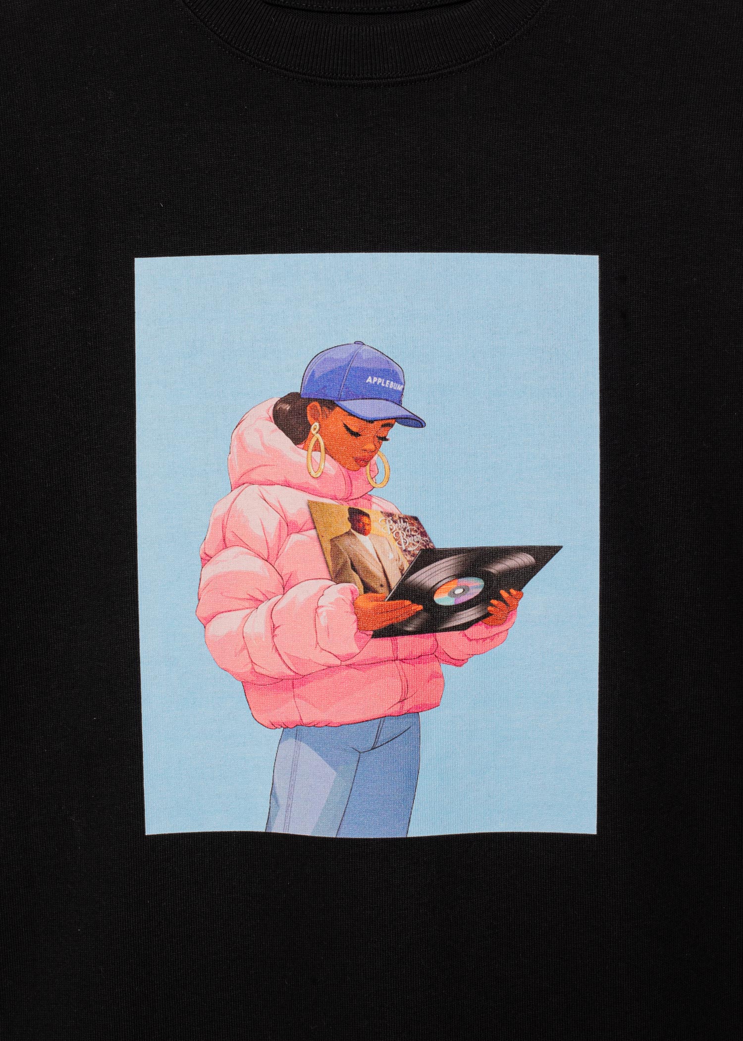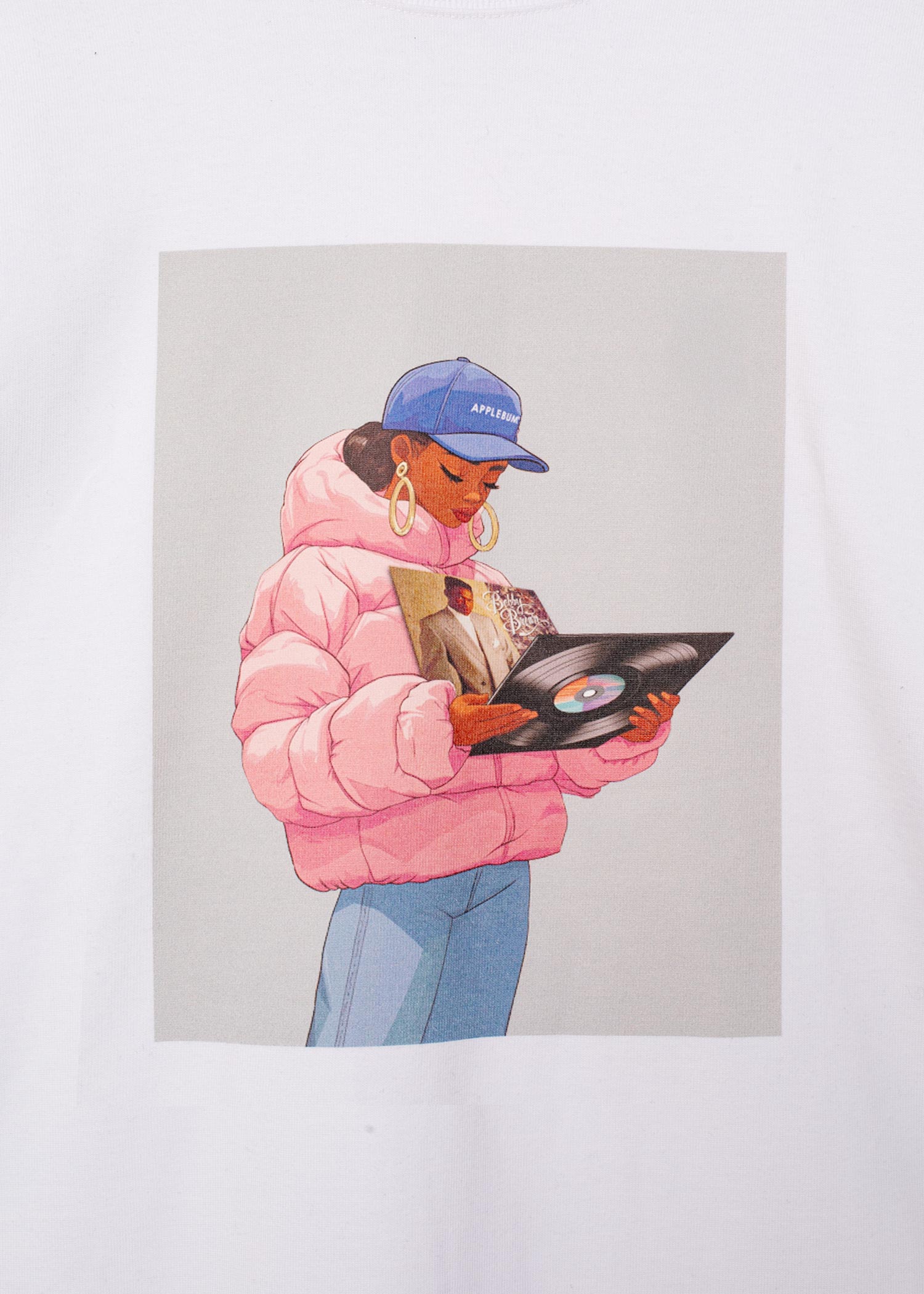 A T-shirt featuring a scene of a girl wearing an APPLEBUM cap picking out "Don't Be Cruel" in a record store.