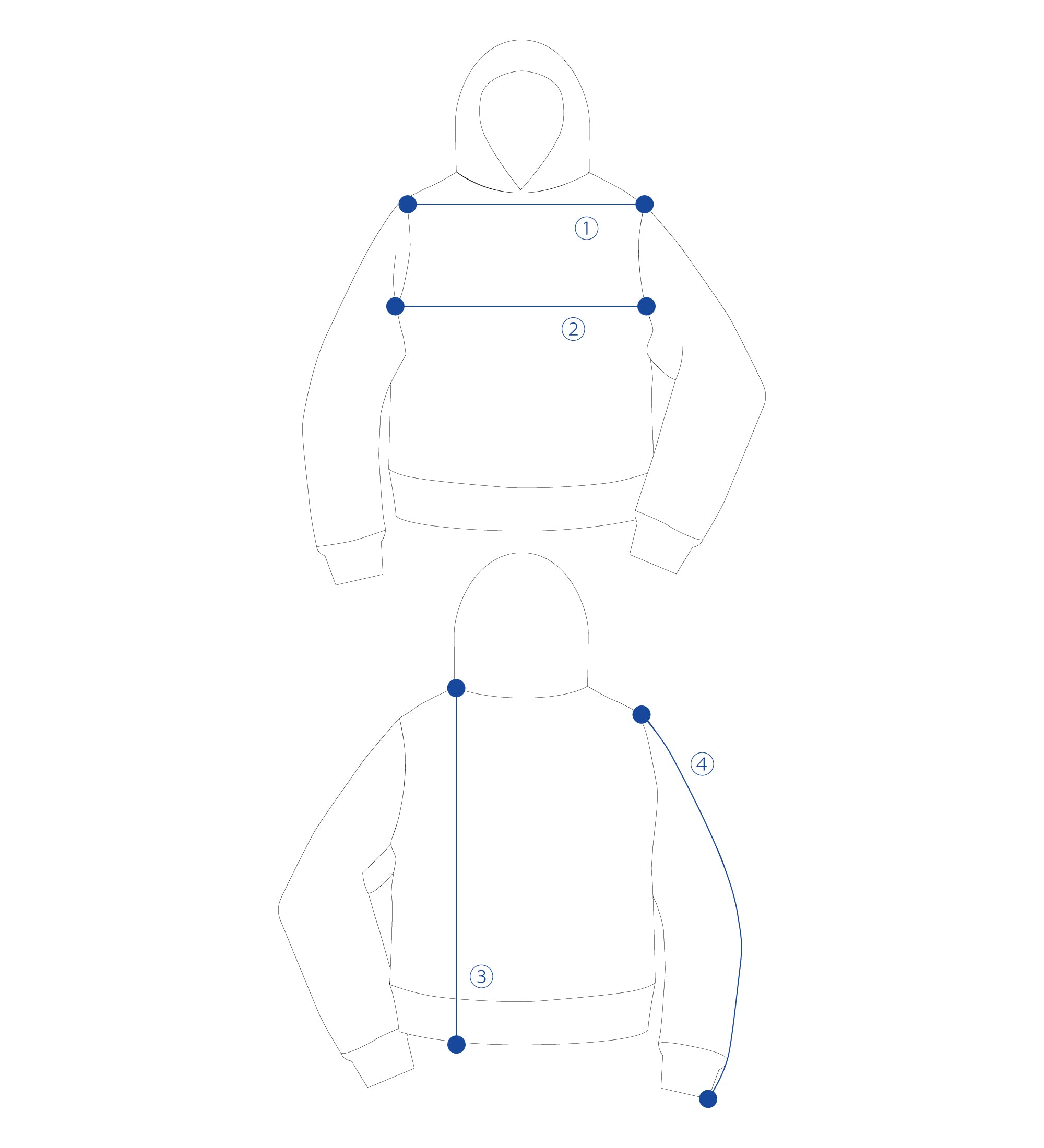 | ① Shoulder width | ② Chest width | ③Length | ④Sleeve length | |