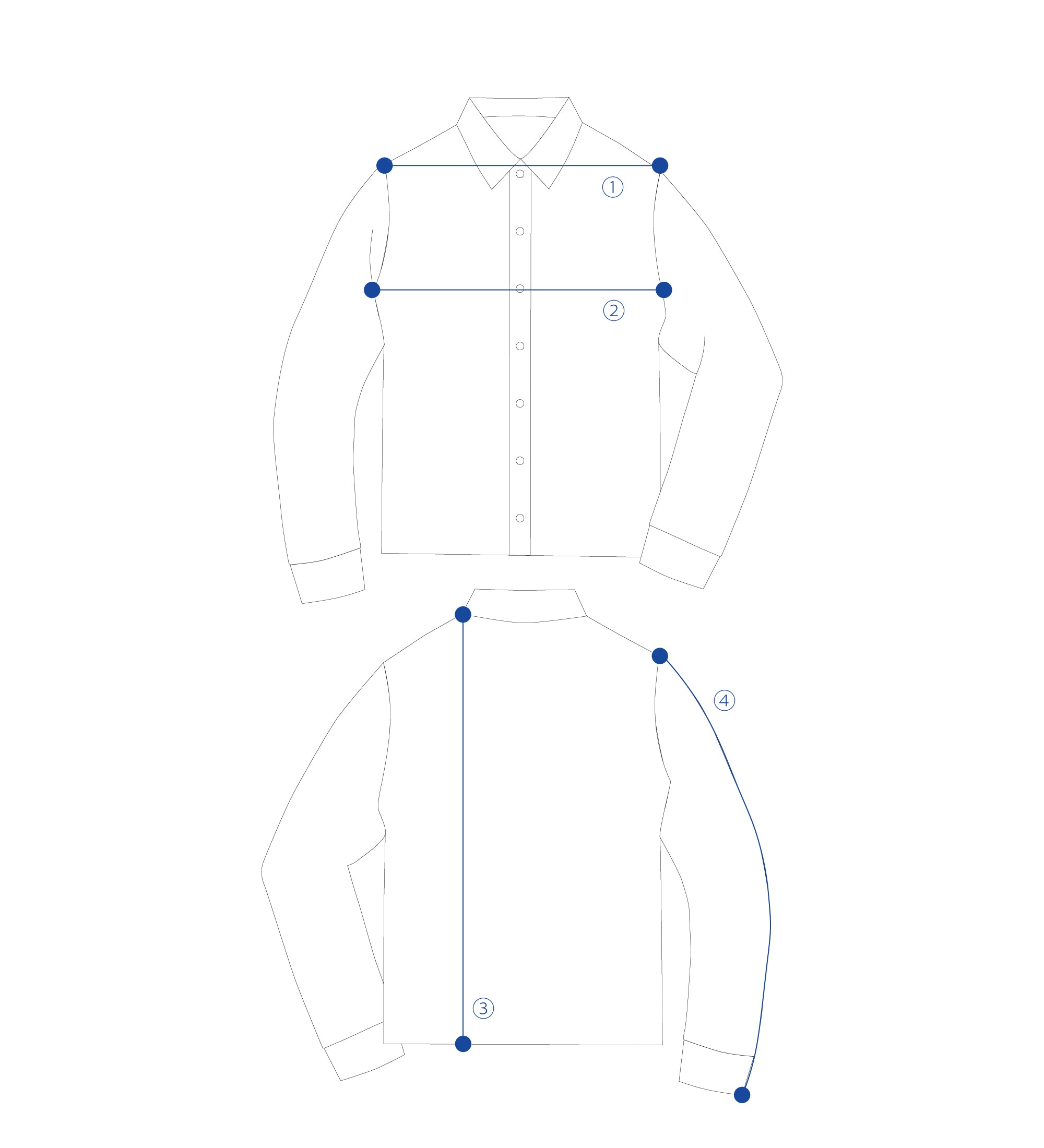| ① Shoulder width | ② Chest width | ③Length | ④Sleeve length | |