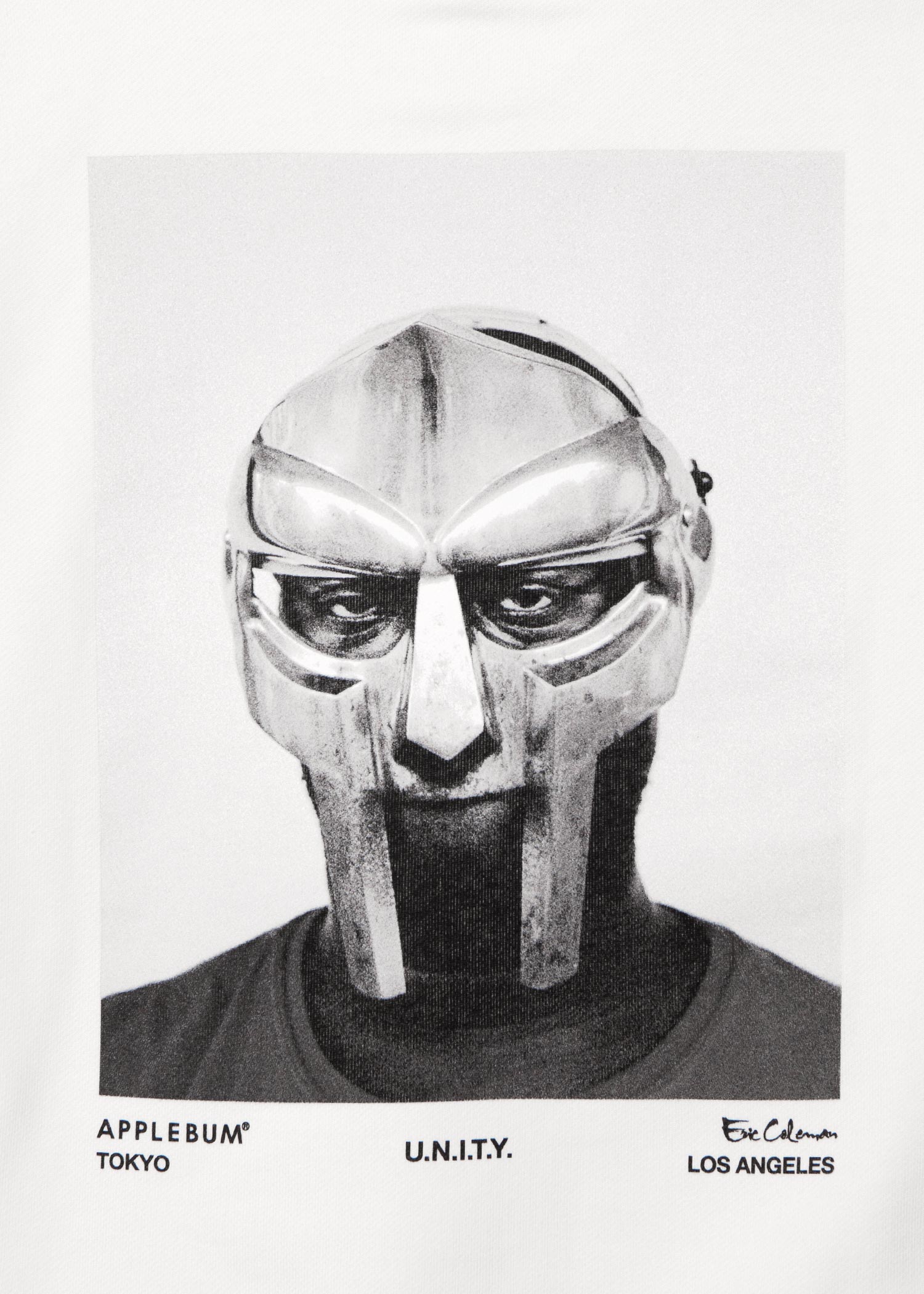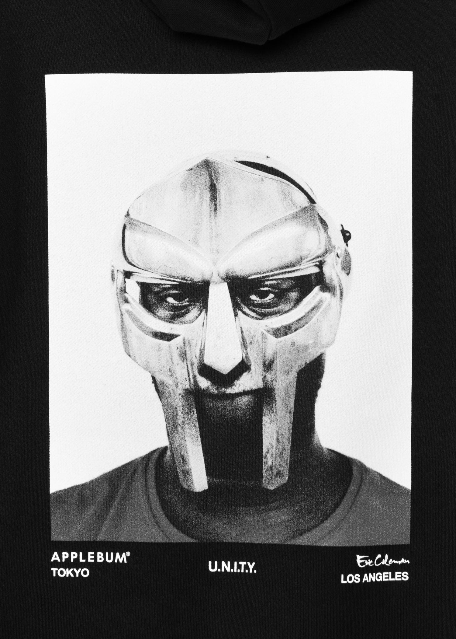 A collaborative sweatshirt from APPLEBUM x Eric Coleman, featuring a bold portrait of legendary MC MF DOOM on the front.