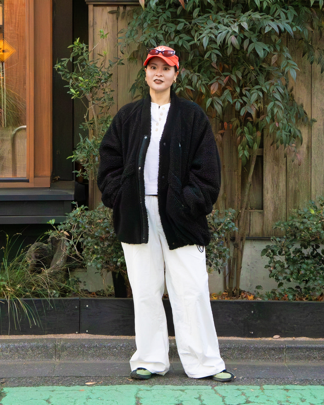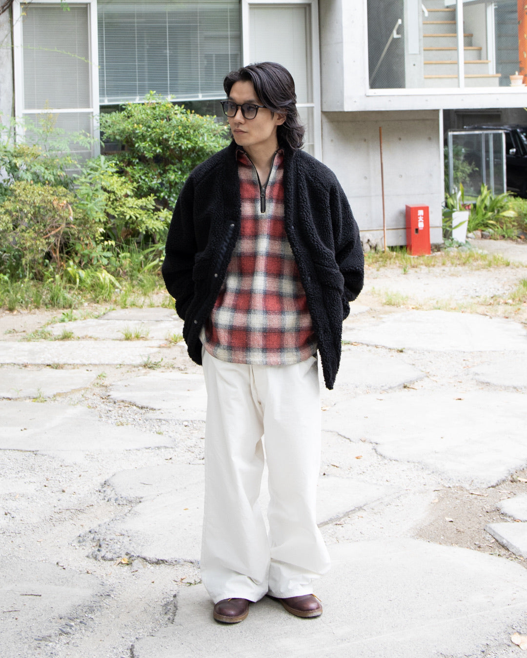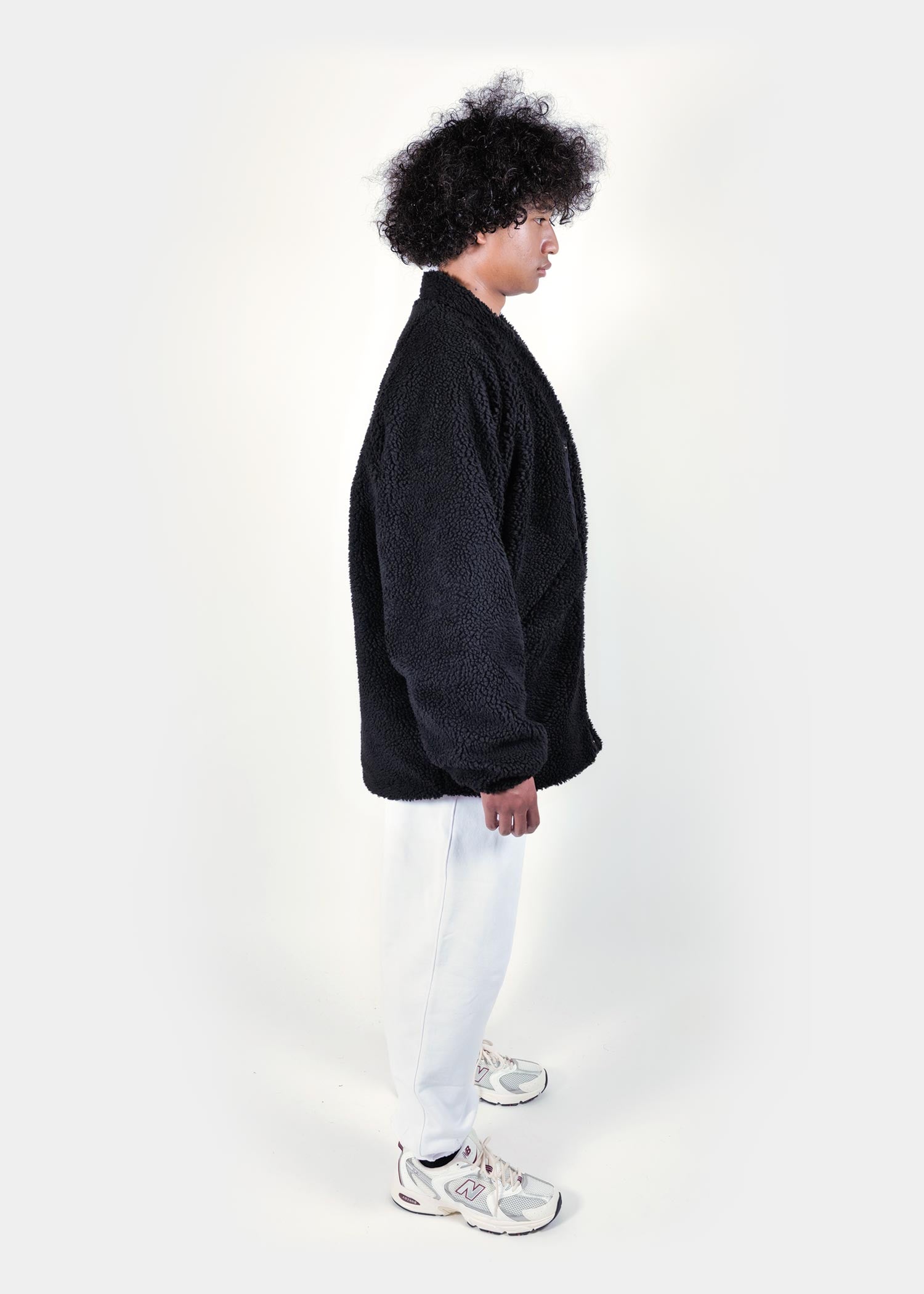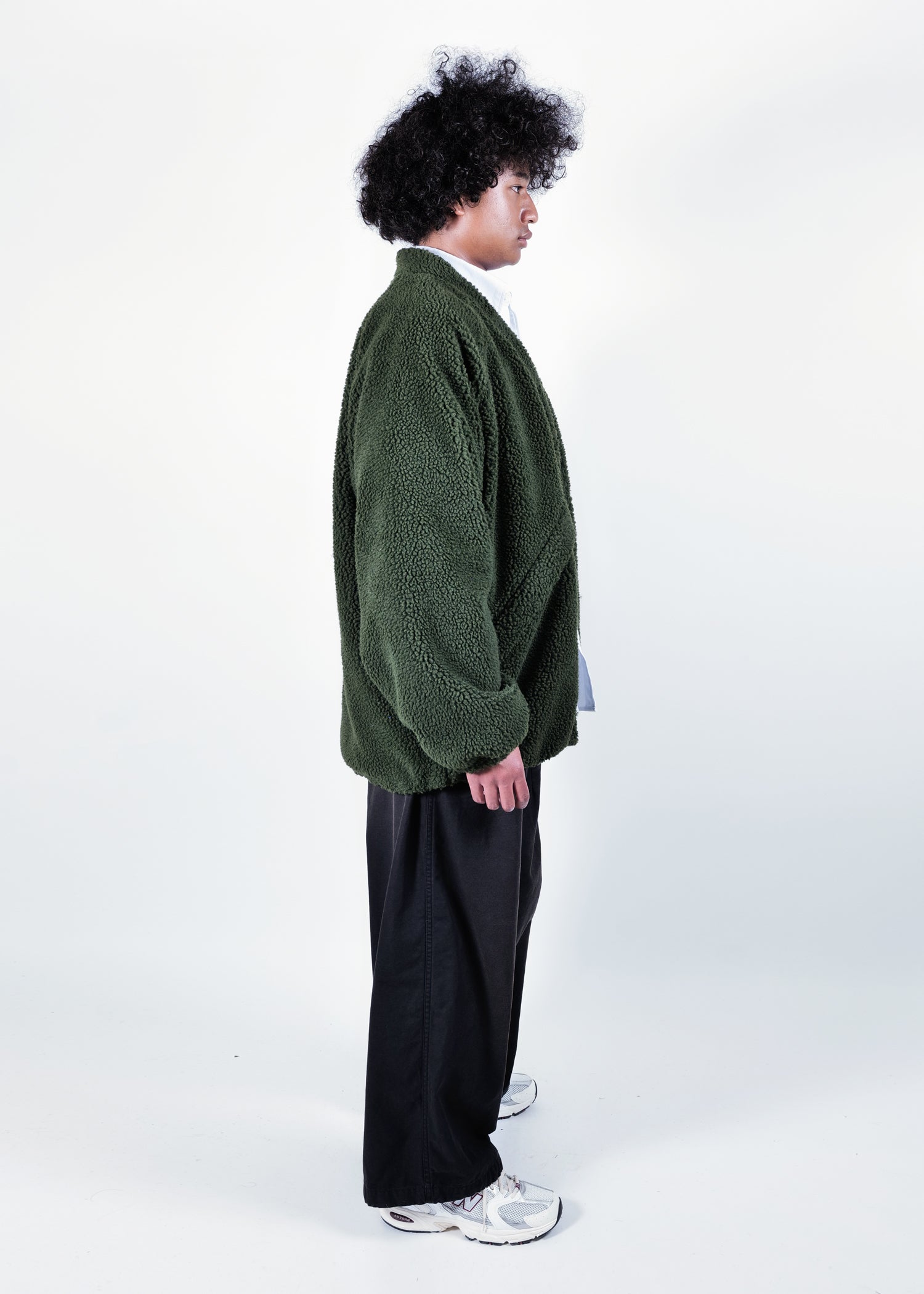 This heavy outerwear is designed in the style of a "hanten" and crafted from boa fleece fabric.