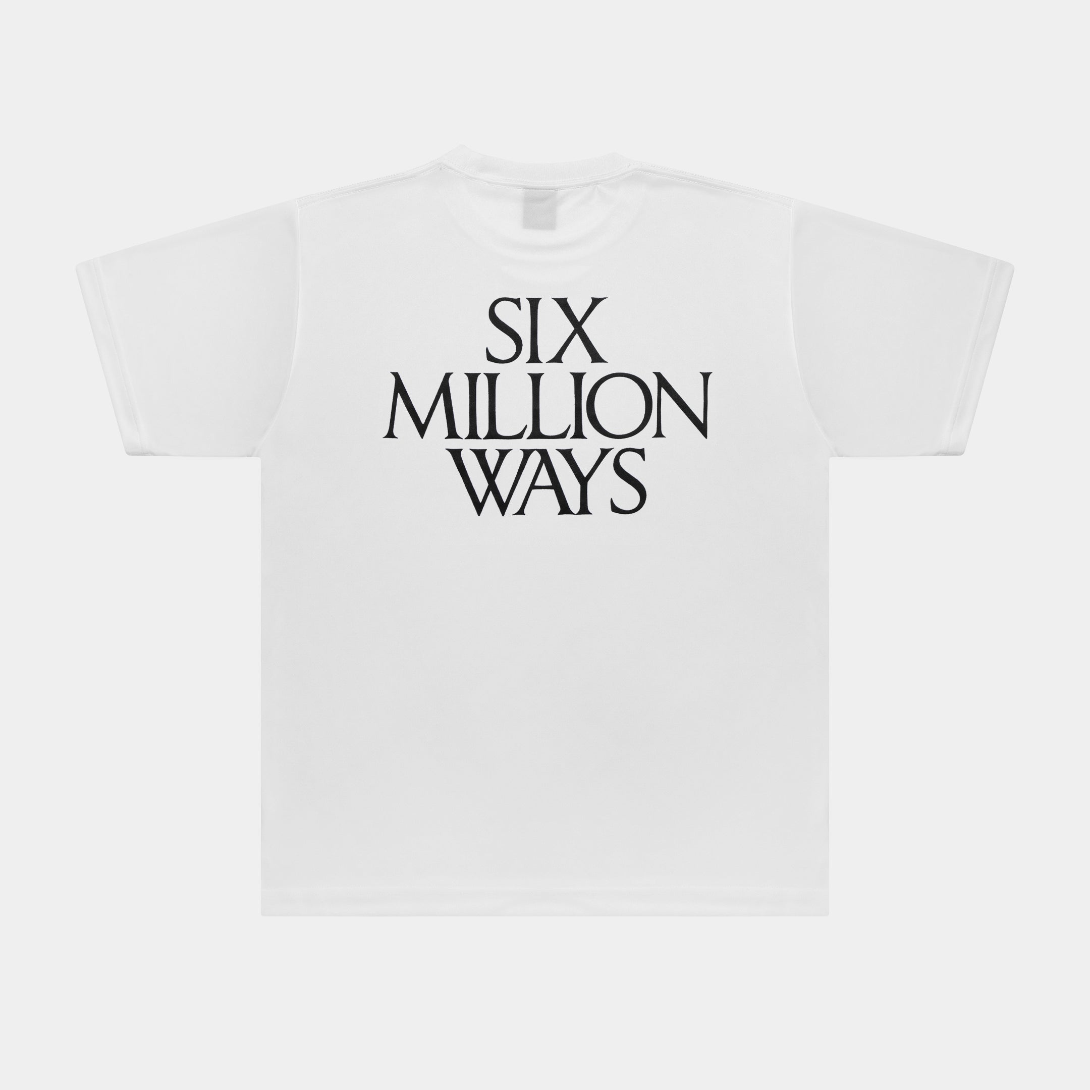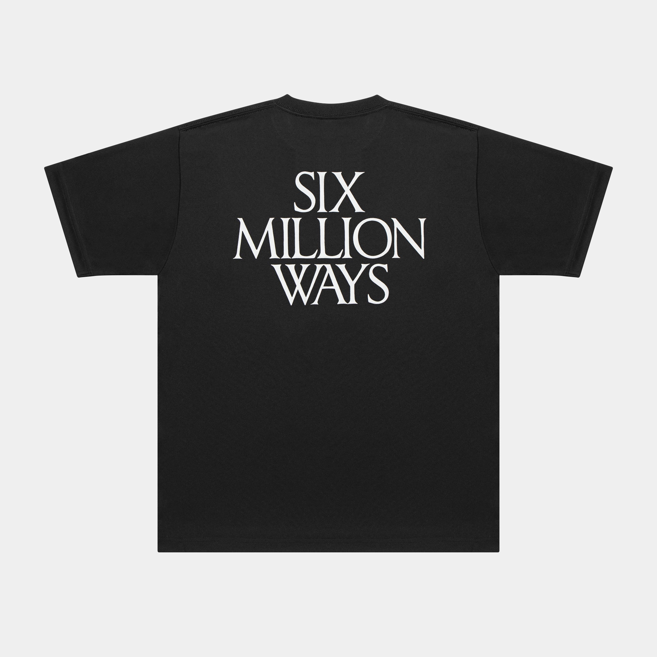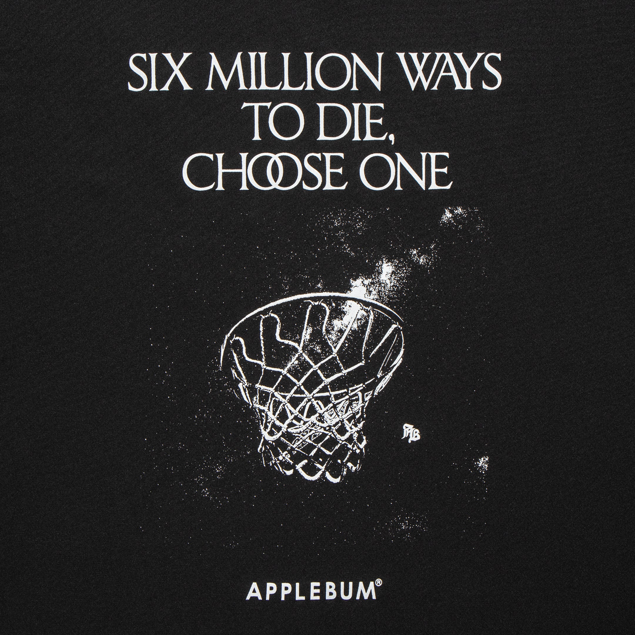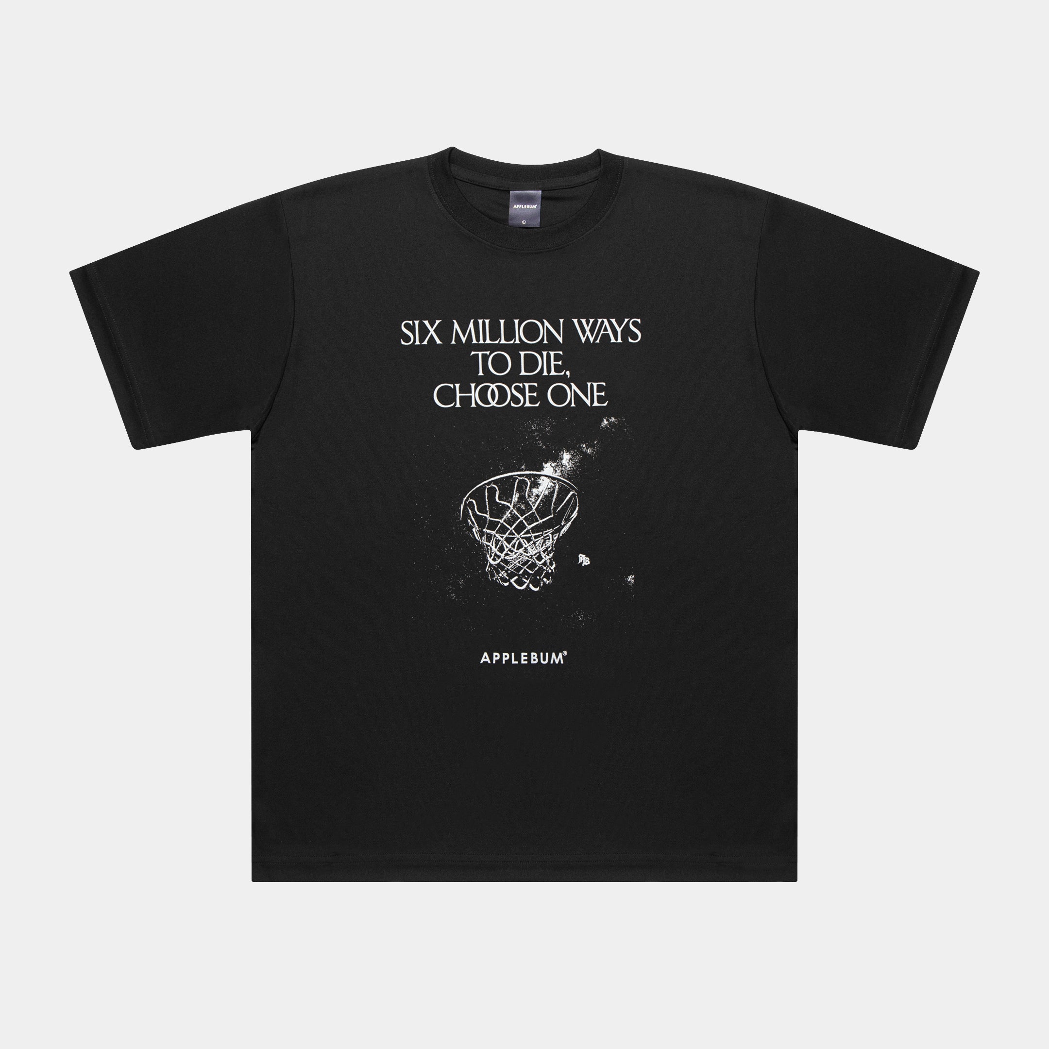 This dry T-shirt features the ultra-aggressive dancehall reggae killer phrase "Six Million Ways To Die, Choose One" along with a basketball goal graphic.