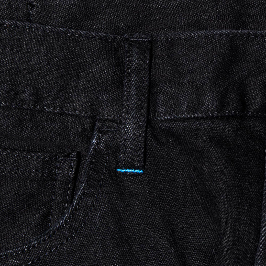 As an accent, the stitching on the right front belt loop is blue.