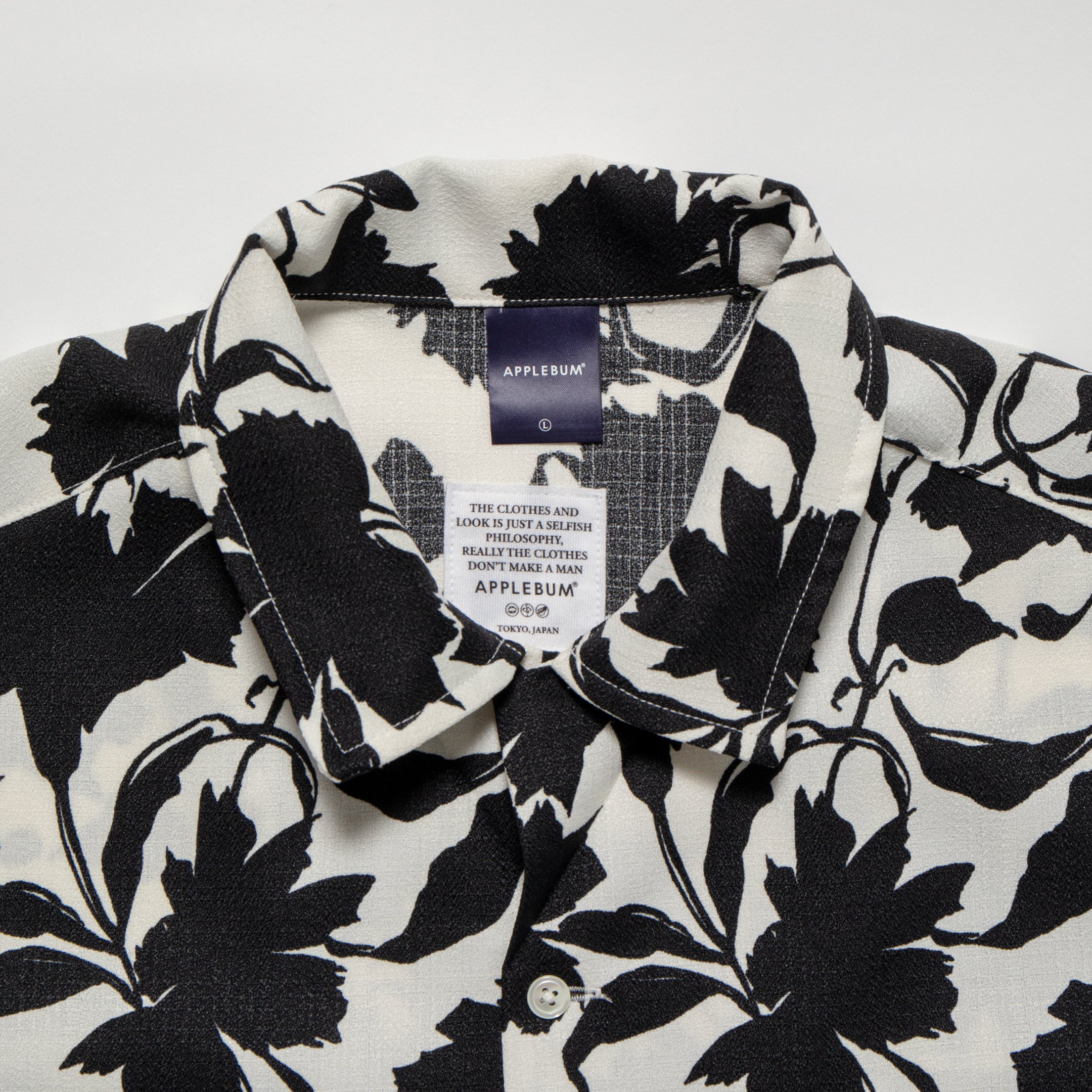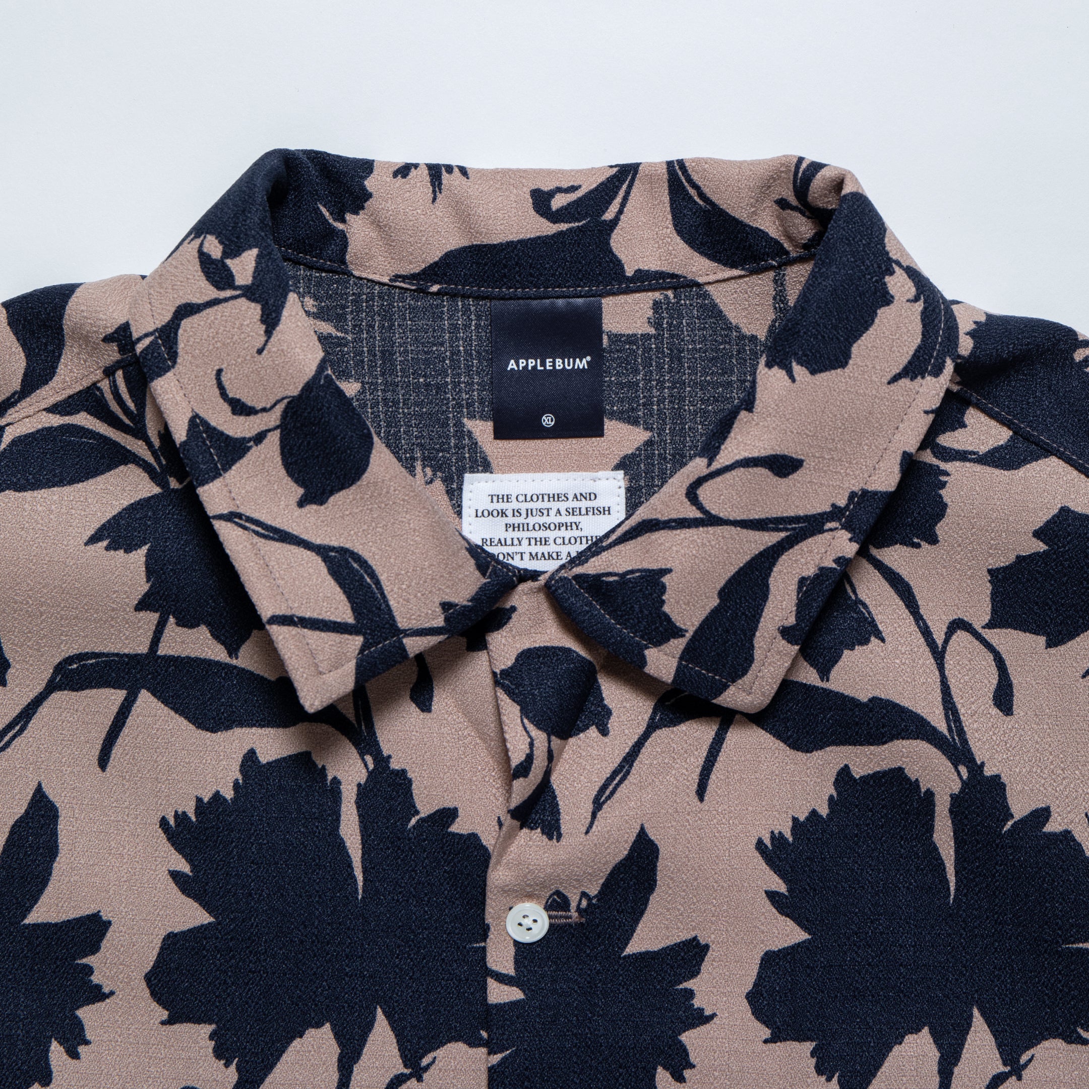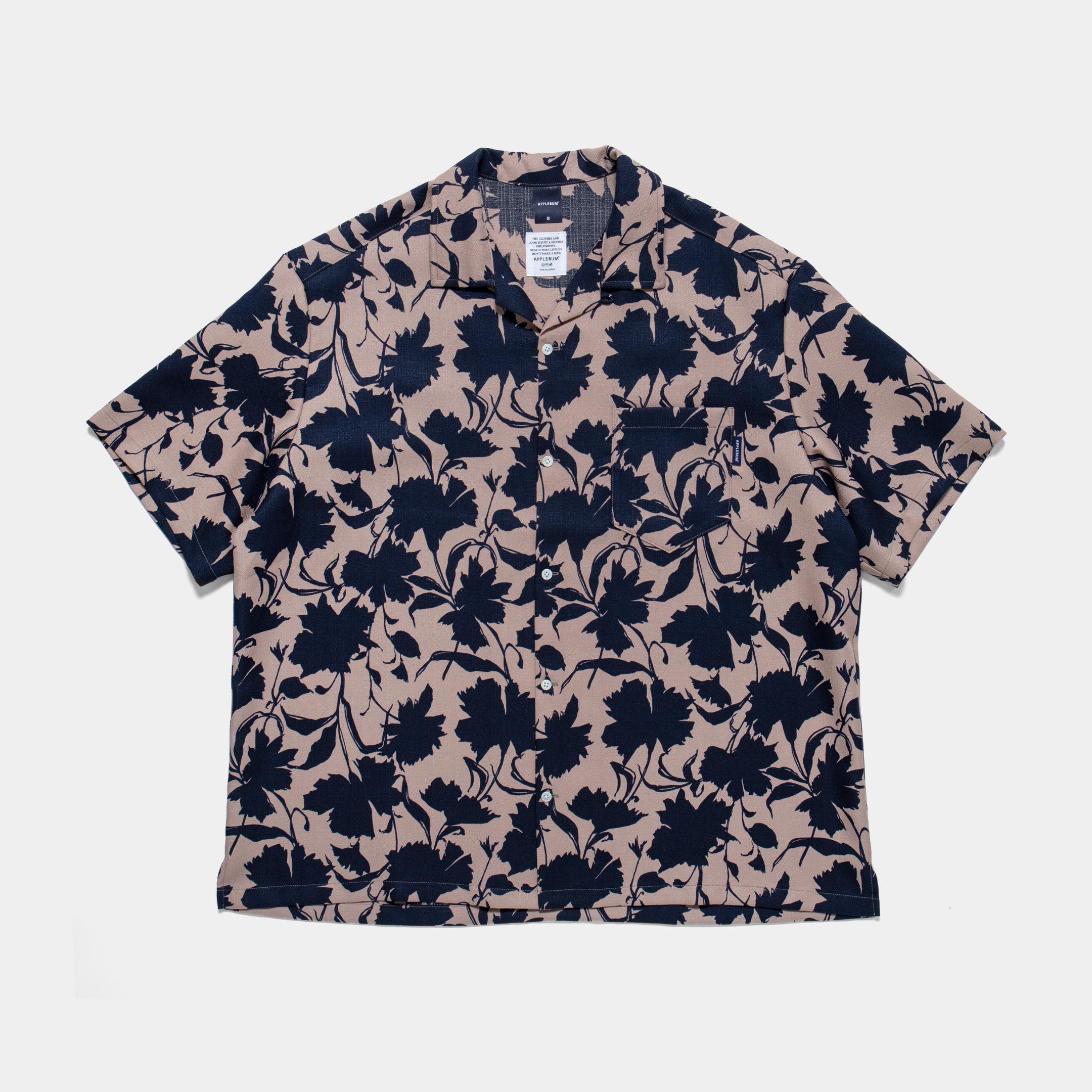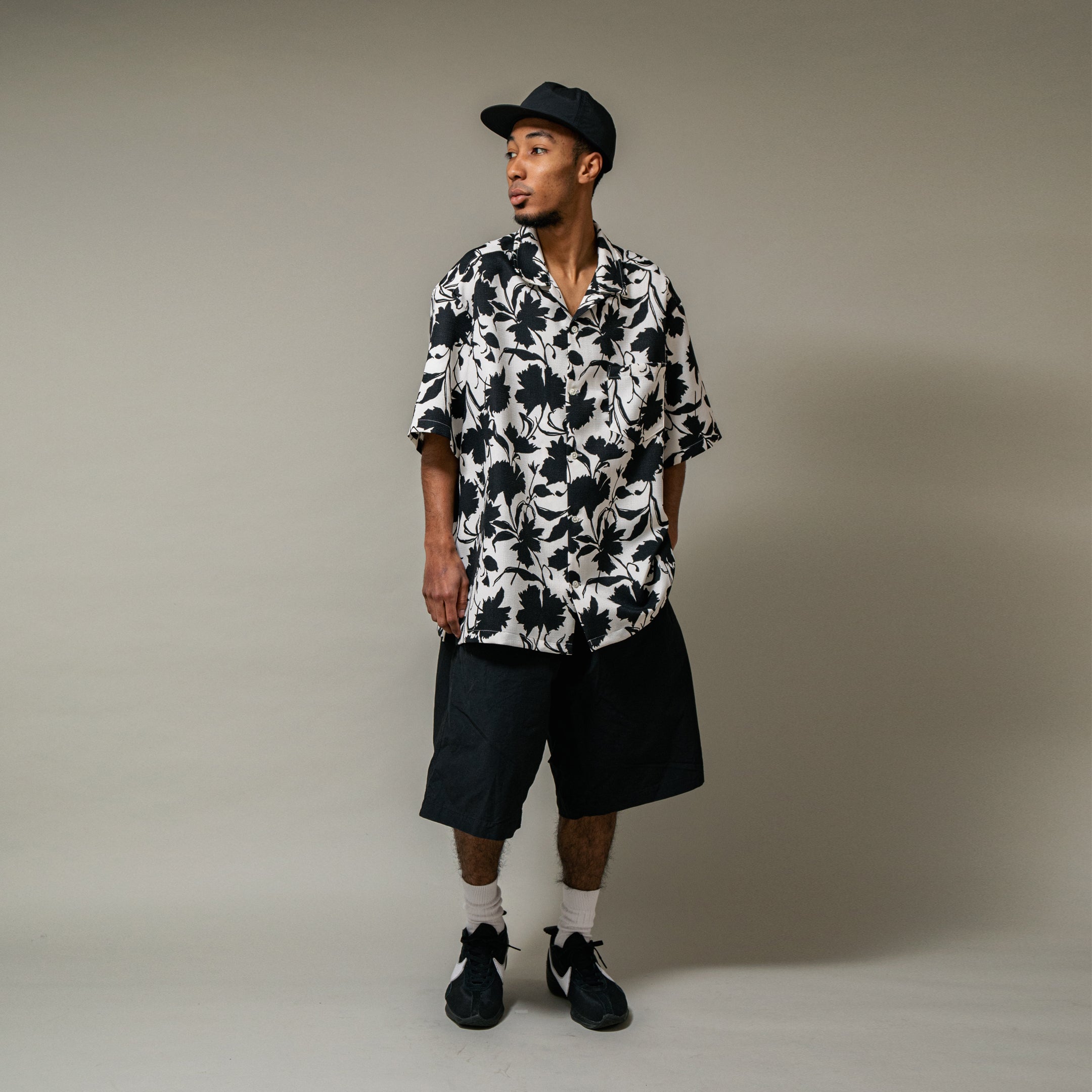 A short-sleeved open-collar shirt featuring an eye-catching leaf pattern.