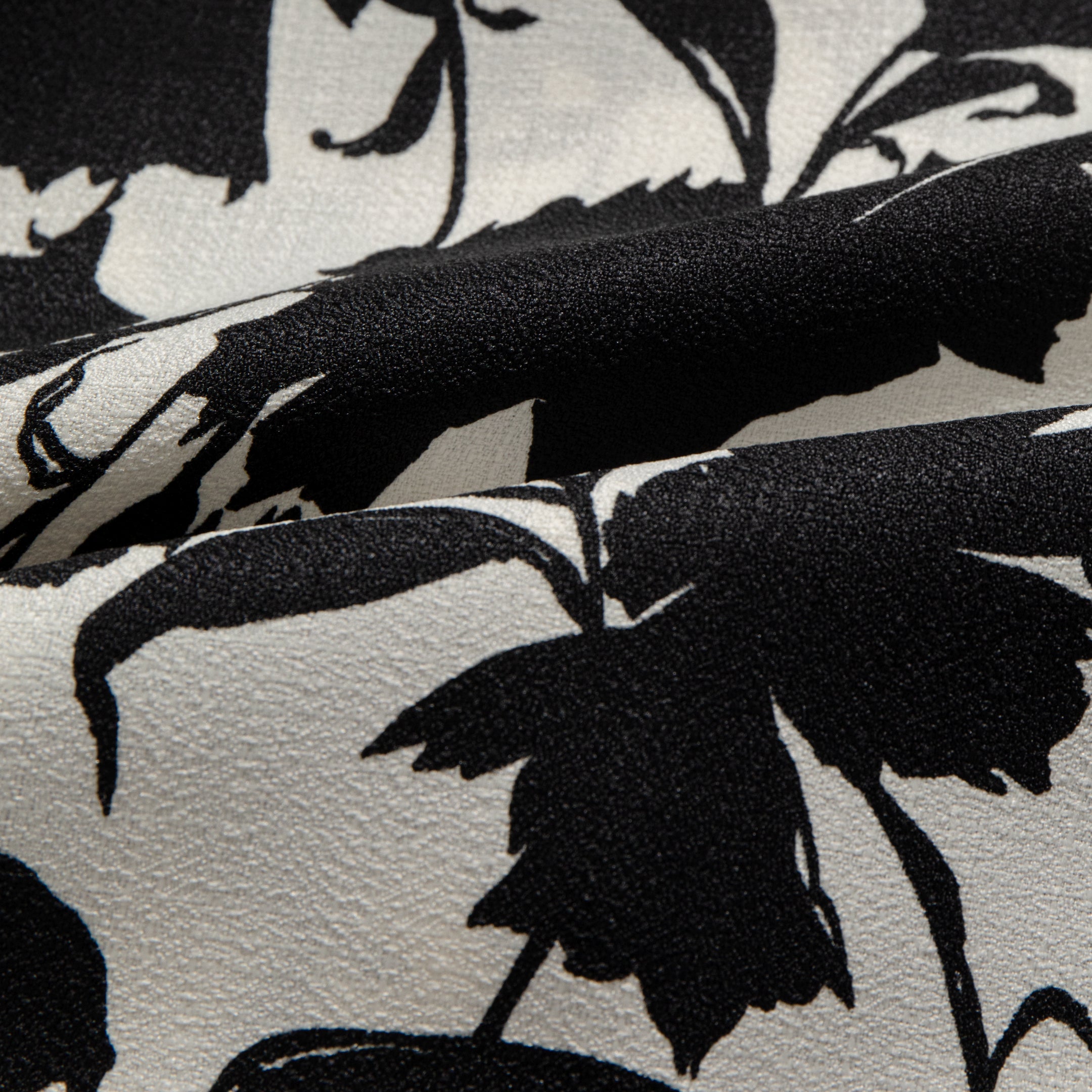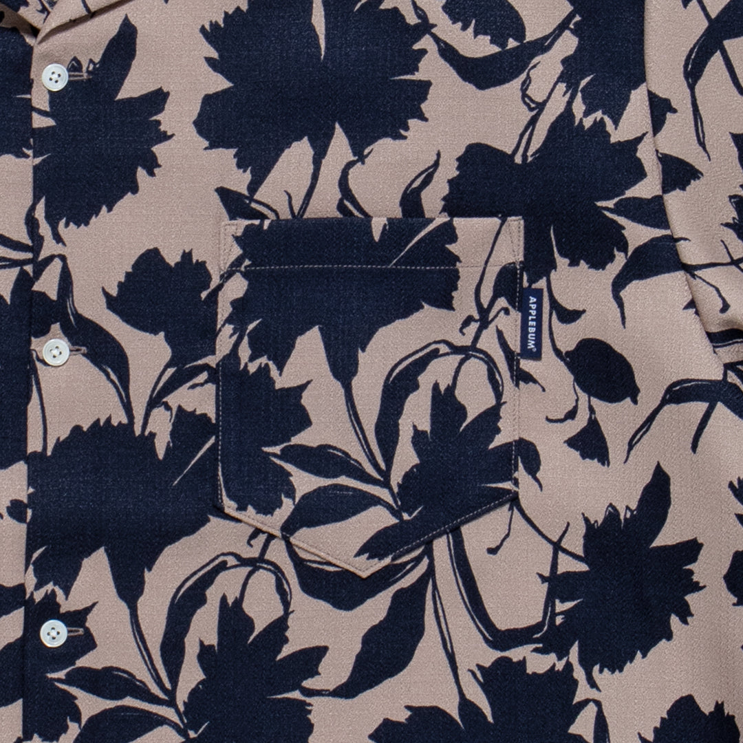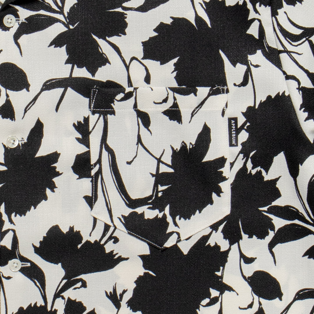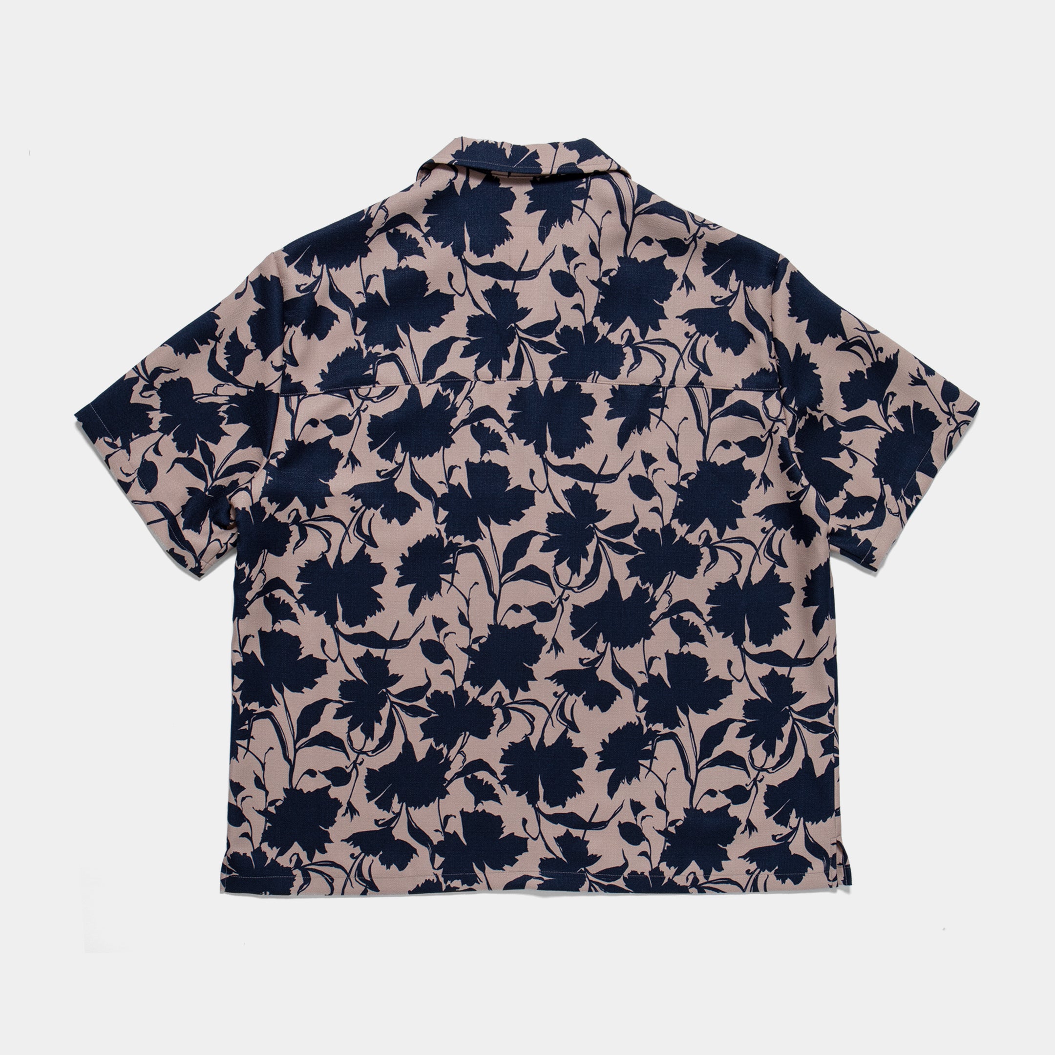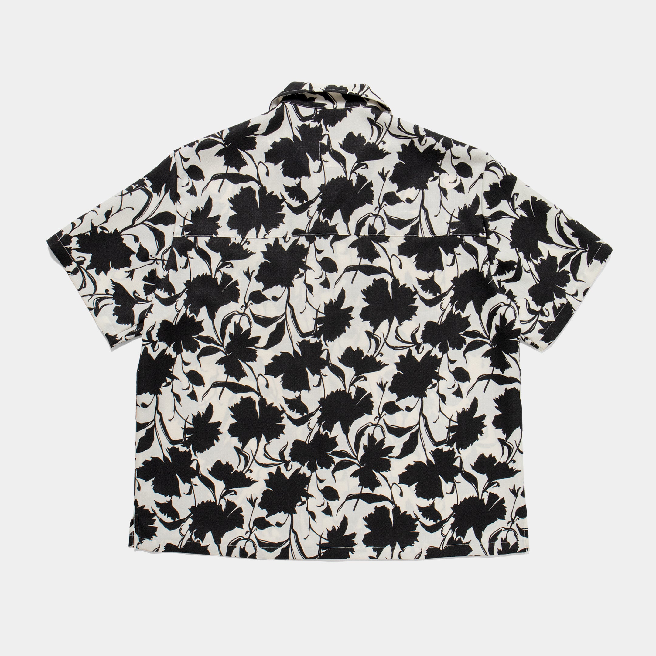 A short-sleeved open-collar shirt featuring an eye-catching leaf pattern.