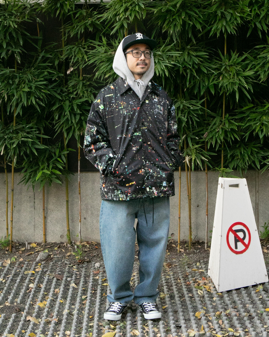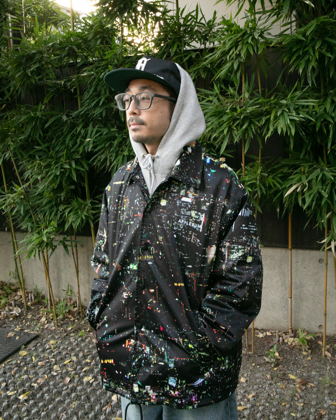 A coach jacket featuring a bold design with the Tokyo night view printed all over.