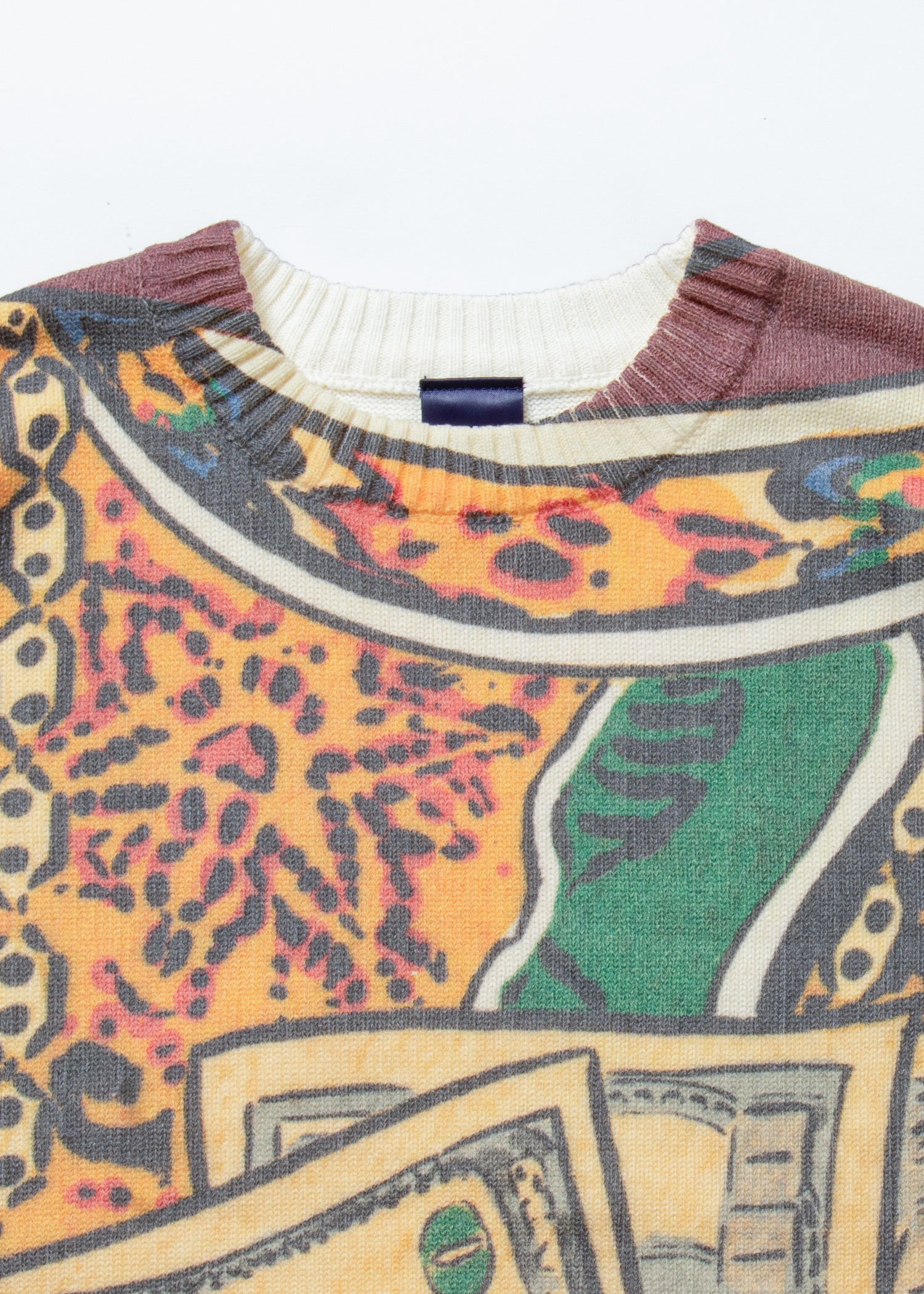 This knit sweater features an all-over print of artwork by artist Ken Hamaguchi, paying homage to the jacquard sweater worn by legendary rapper BIG during his lifetime.