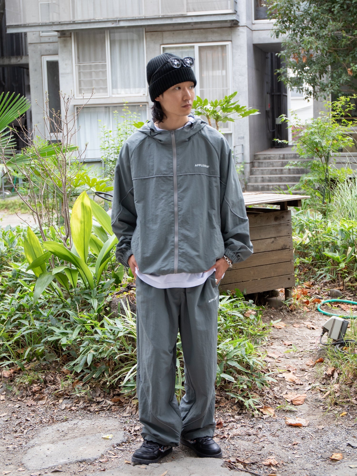 Track pants made from matte nylon fabric.