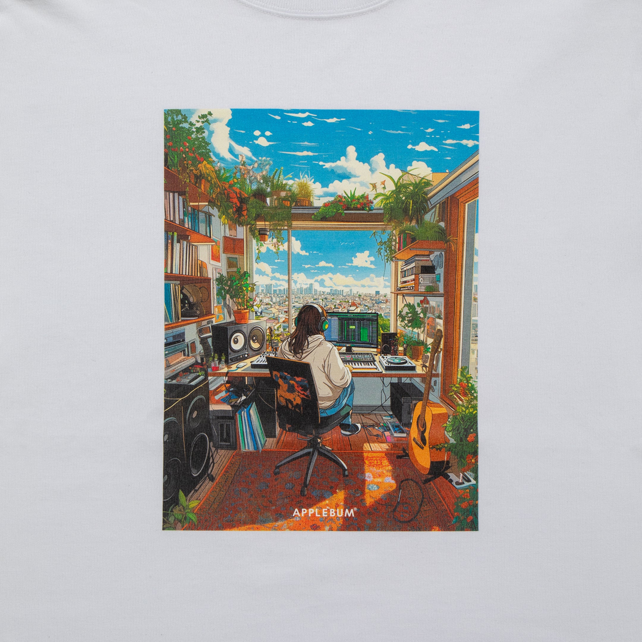 A graphic T-shirt with a motif of a fictional musician's production room, drawn in a Japanese anime style.