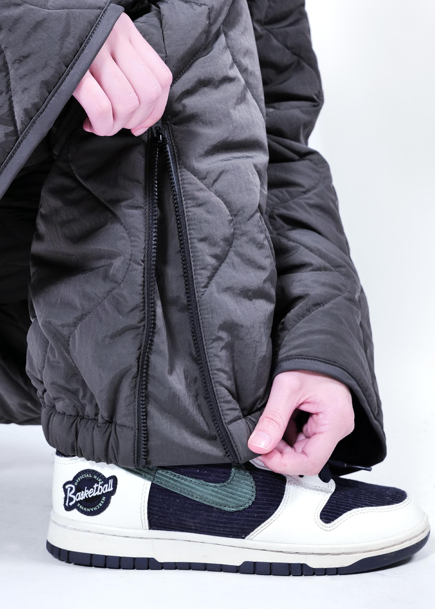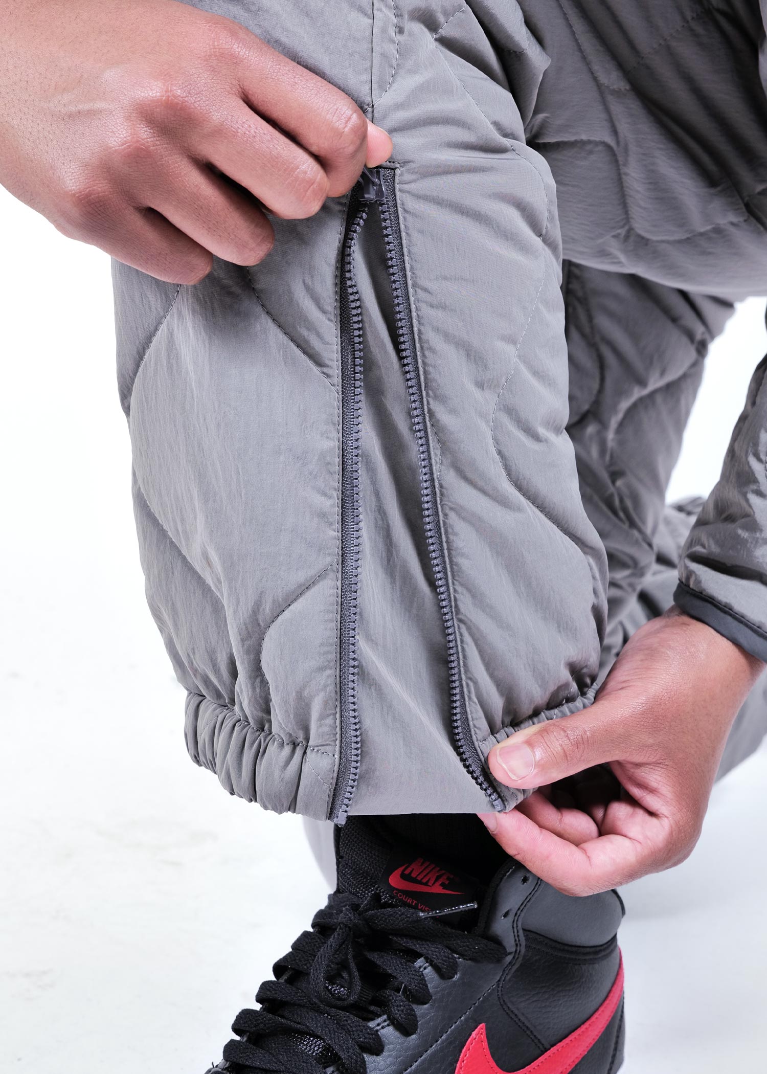 Quilted pants that resemble military liners.
