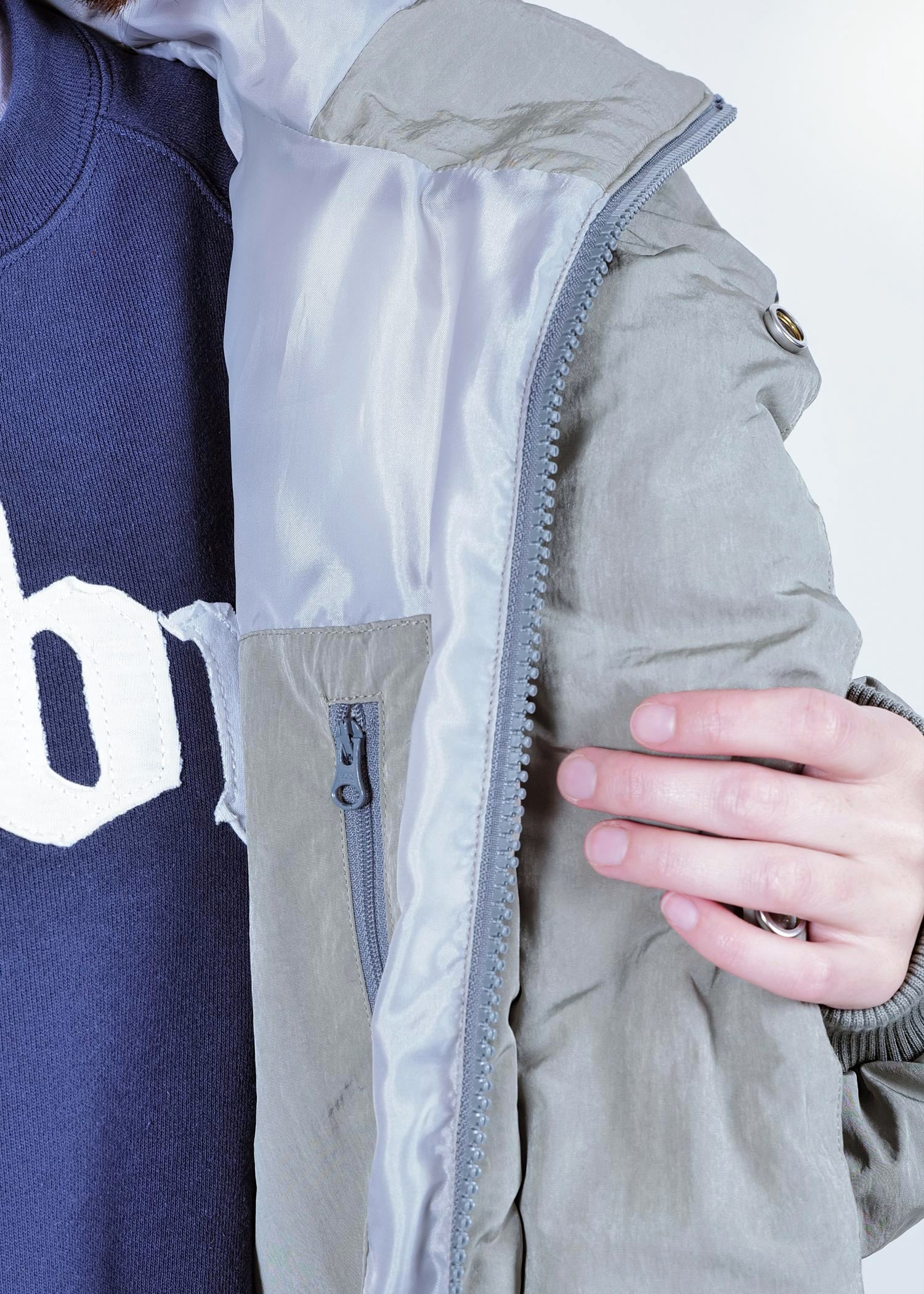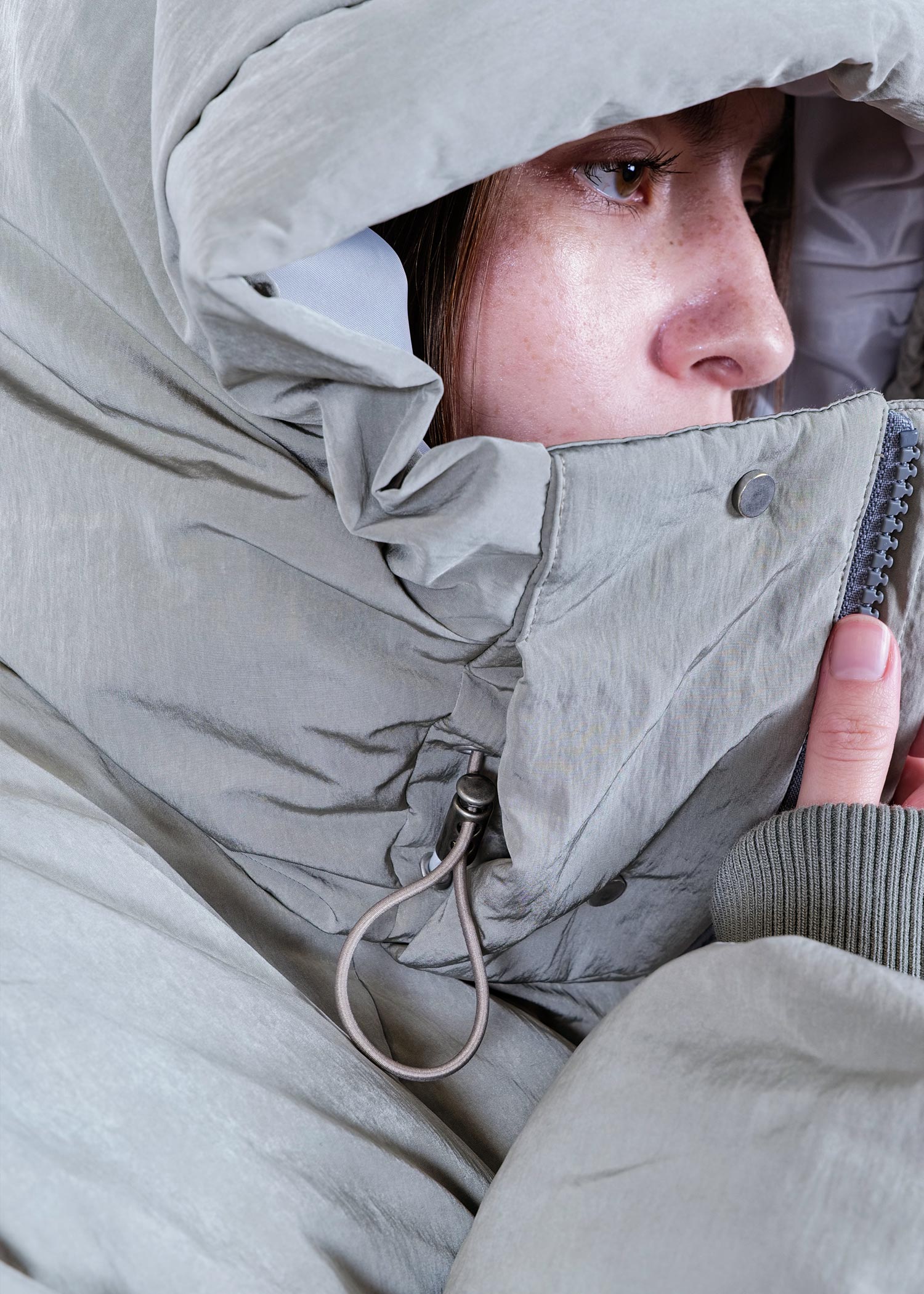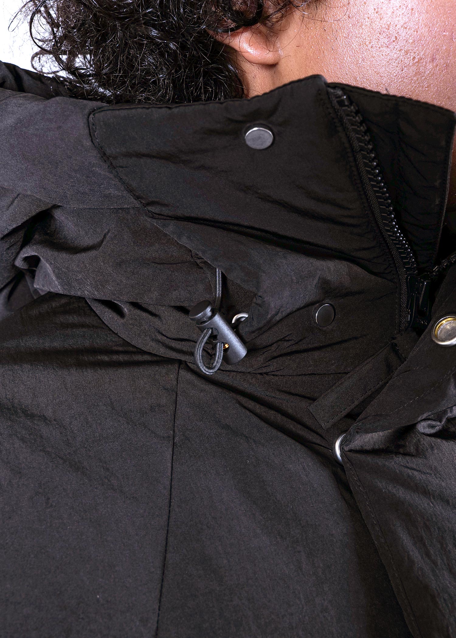 It provides completely different impressions when the hood is up, when the zipper is fully closed, and when the zipper is open, allowing for various styling options.