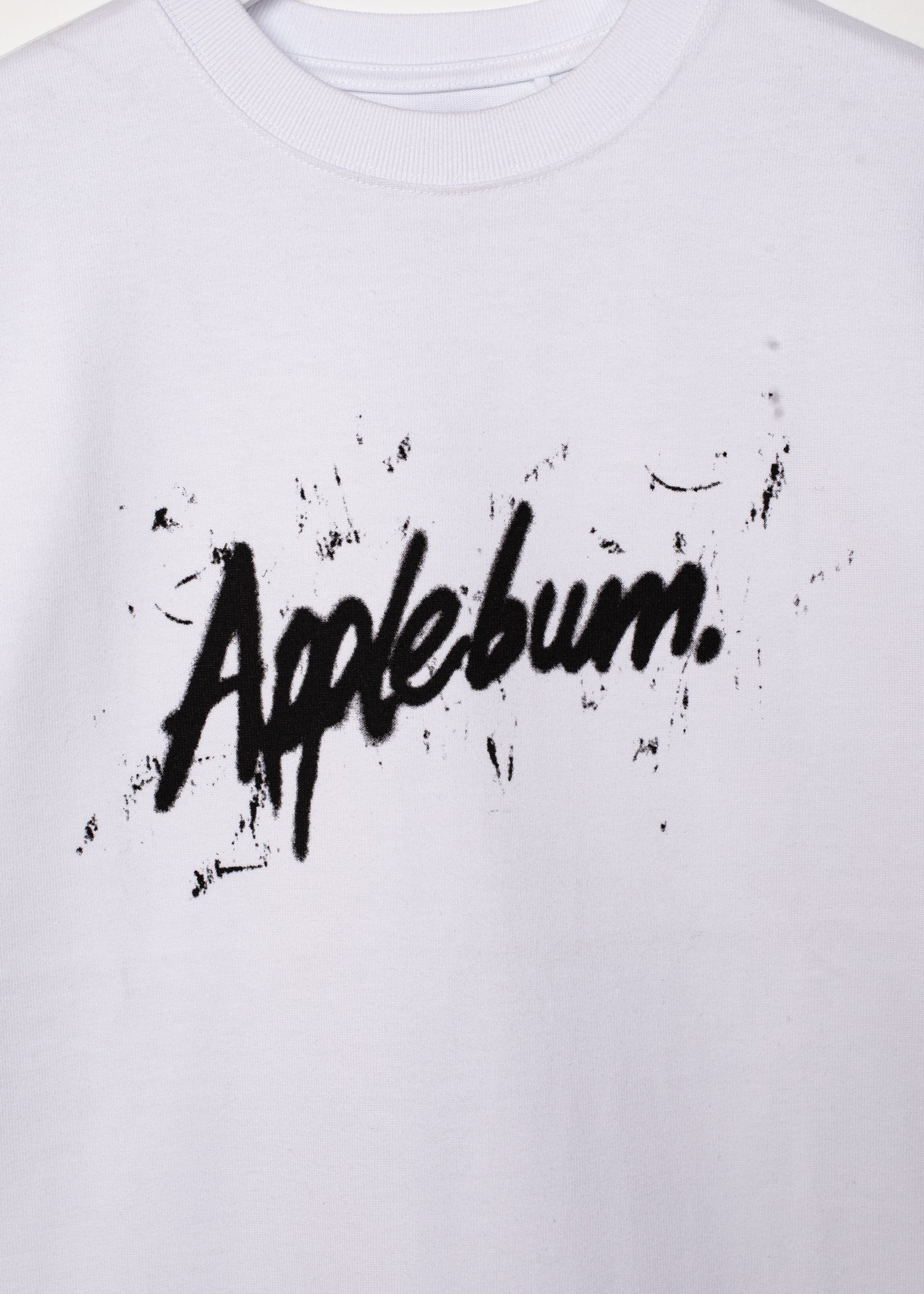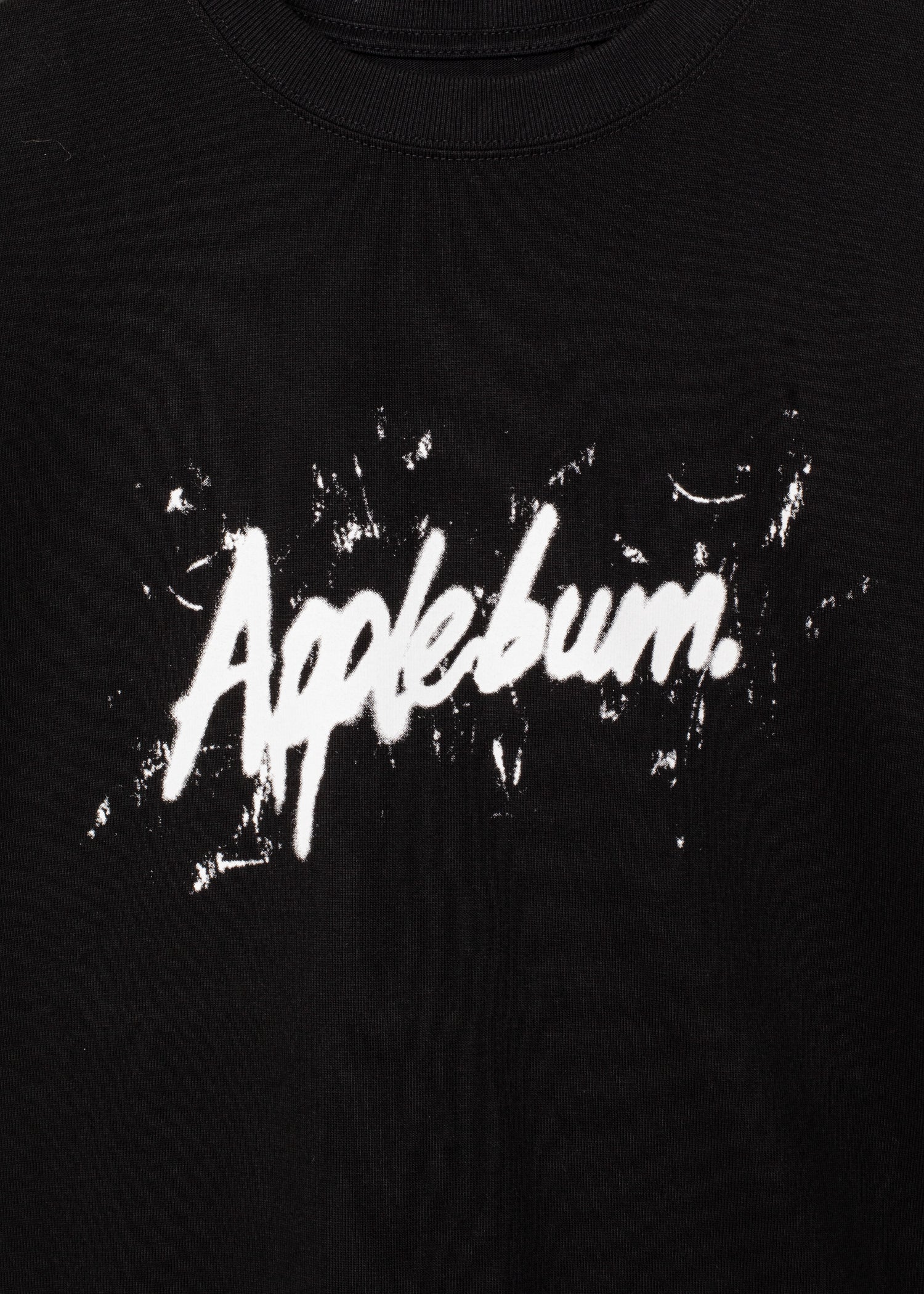 A T-shirt with a bold print of the APPLEBUM logo "tagged by a fictional graffiti artist."